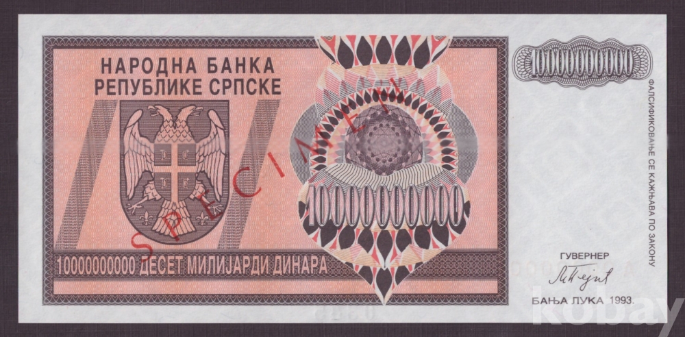 액면 : 10,000,000,000 디나르 발행 : 1993년 상태 : 미사용 비고 : P-148s, 견양권