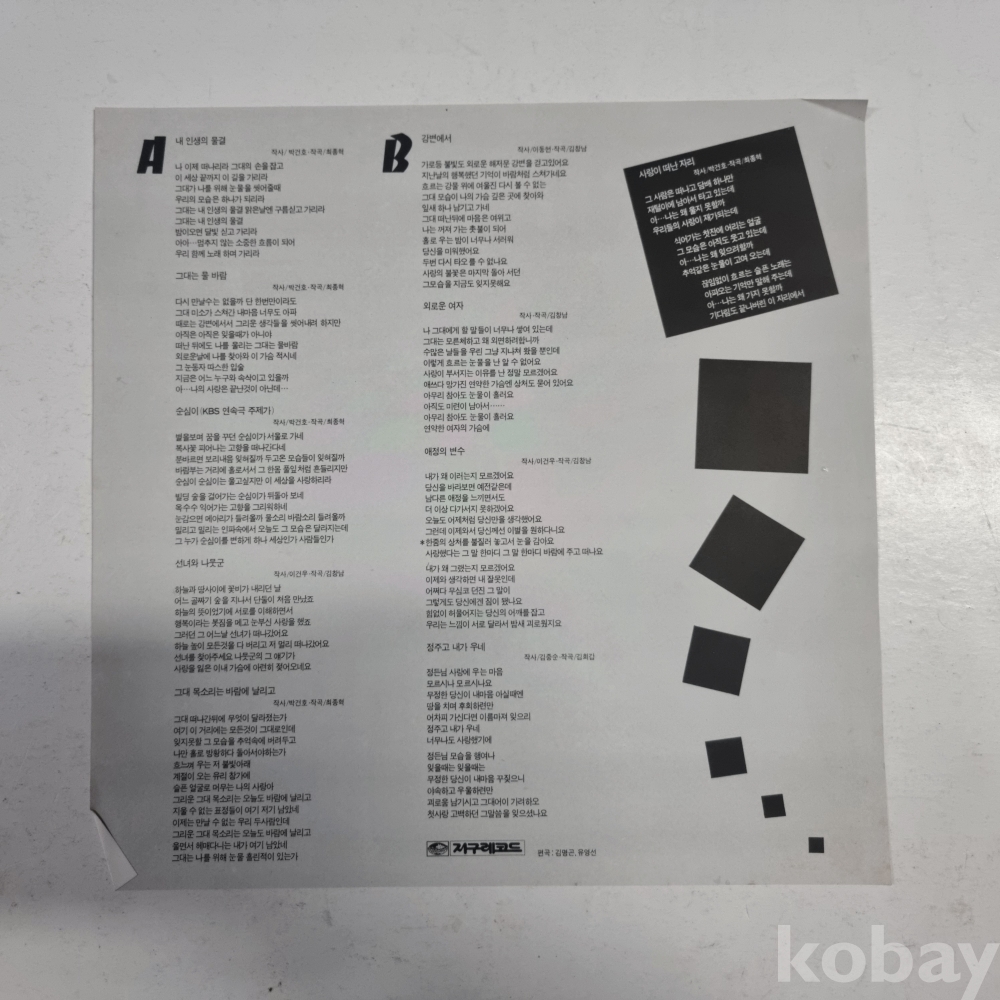 | 자켓상태 | EX : 약간의 마모, 모서리 찢김 존재 | 음반상태 | EX : 재생에 영향 없는 가벼운 기스 존재 | 발매정보 | 알수없음 | 가사지여부 | 유 |