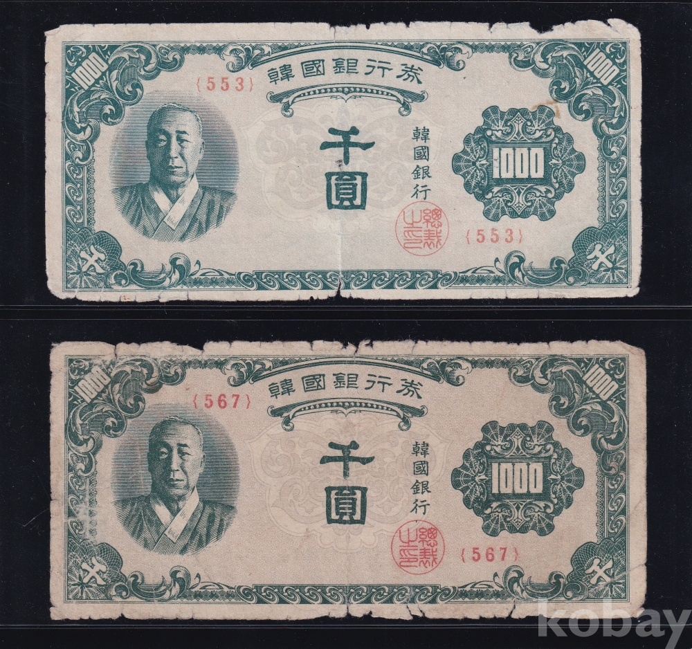 - 한국은행 최초의 1,000원권인 이승만 한복 천원 한국인쇄 판번호 553번 / 567번 지폐 입니다.