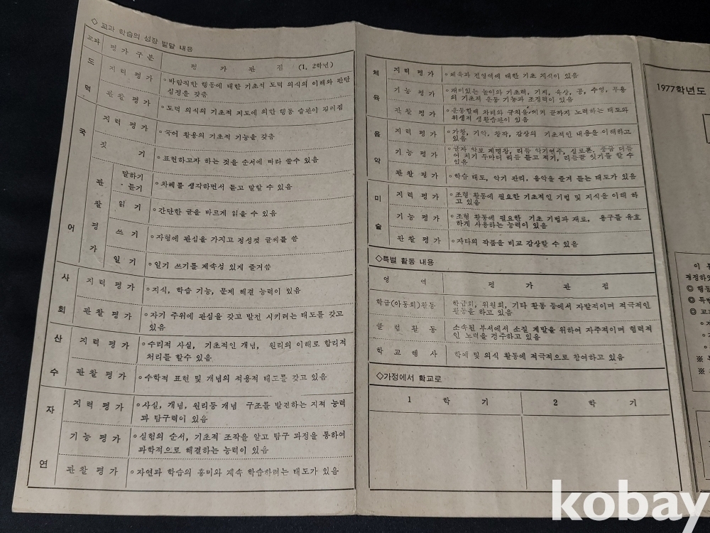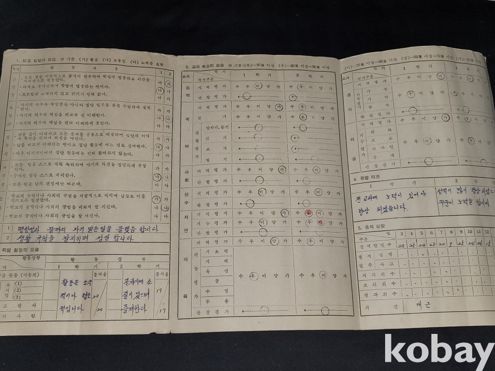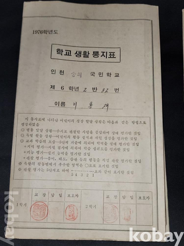 빈티지 세월 감이 느껴지는 70년대 생활통지표 2종과 80년대 졸업장, 개근상 등 각종 상장 자료 5종 일괄입니다.