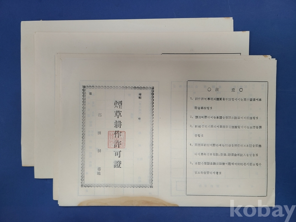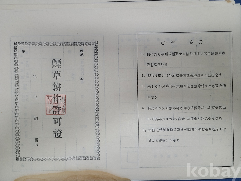 1950-60년대 煙草耕作許可證 10매*주소,성명,허가사항,저장장,건조장,수확량 등을 적도록 되어있고 주의사항이 수록되어 있다