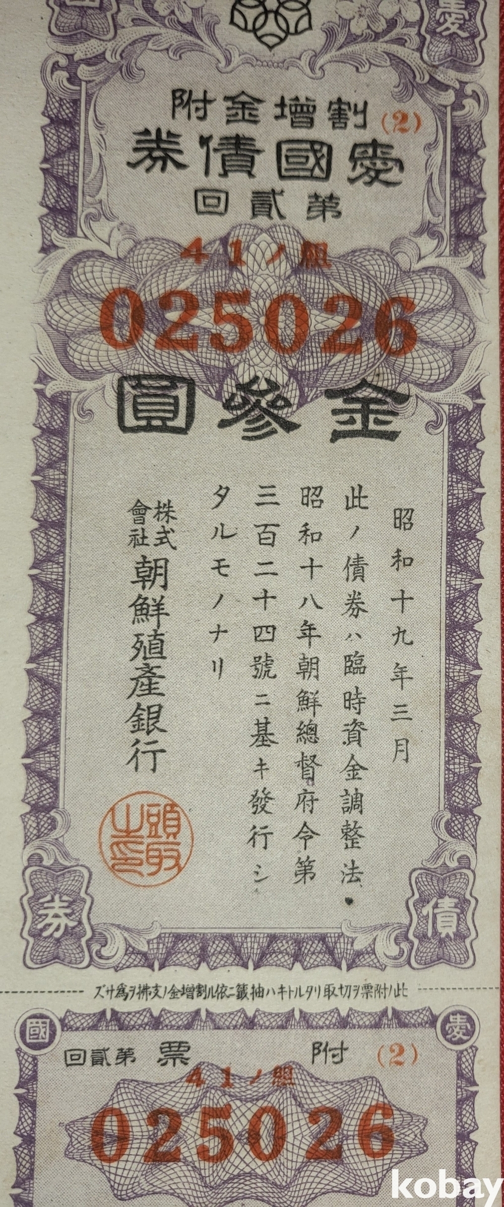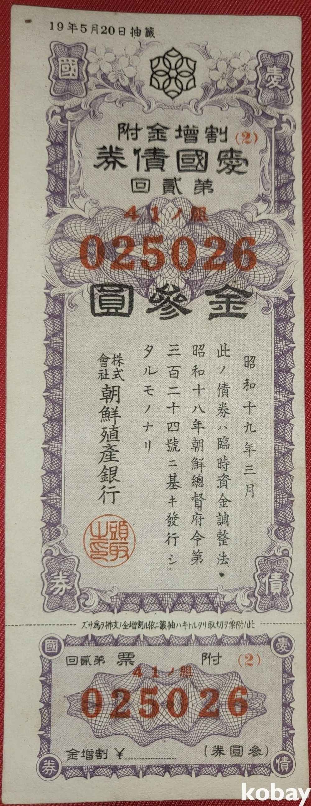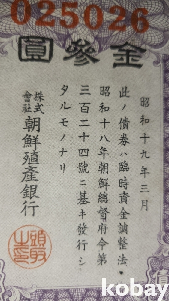 주식회사 조선 직산은행 소하19년(1943년) 발행된 할증금부(割增金附)입니다,