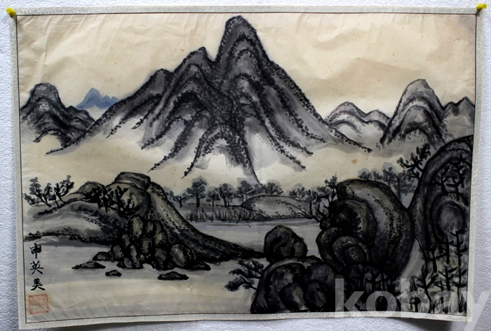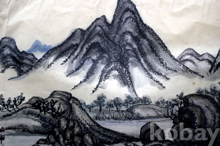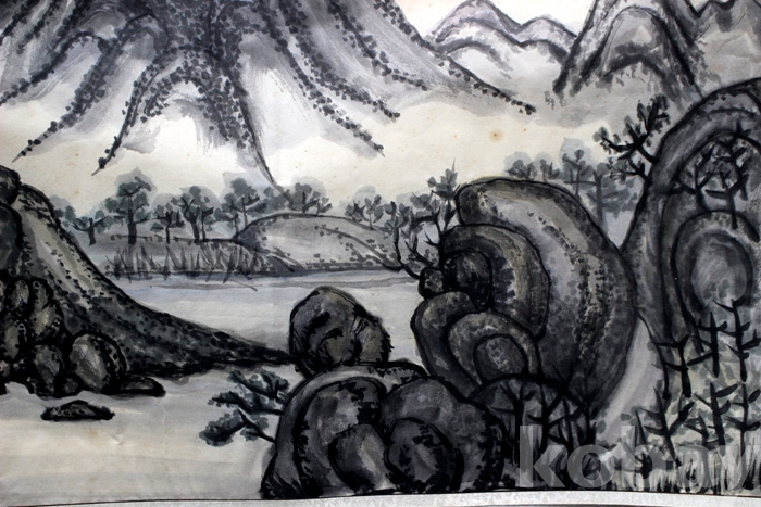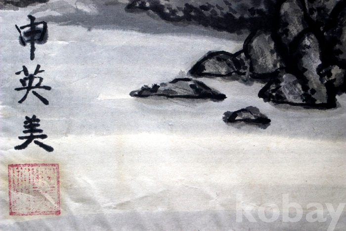 부드러운 견바닥에 그린 신영미의 작품 - 수묵이 짙은 강가의 풍경