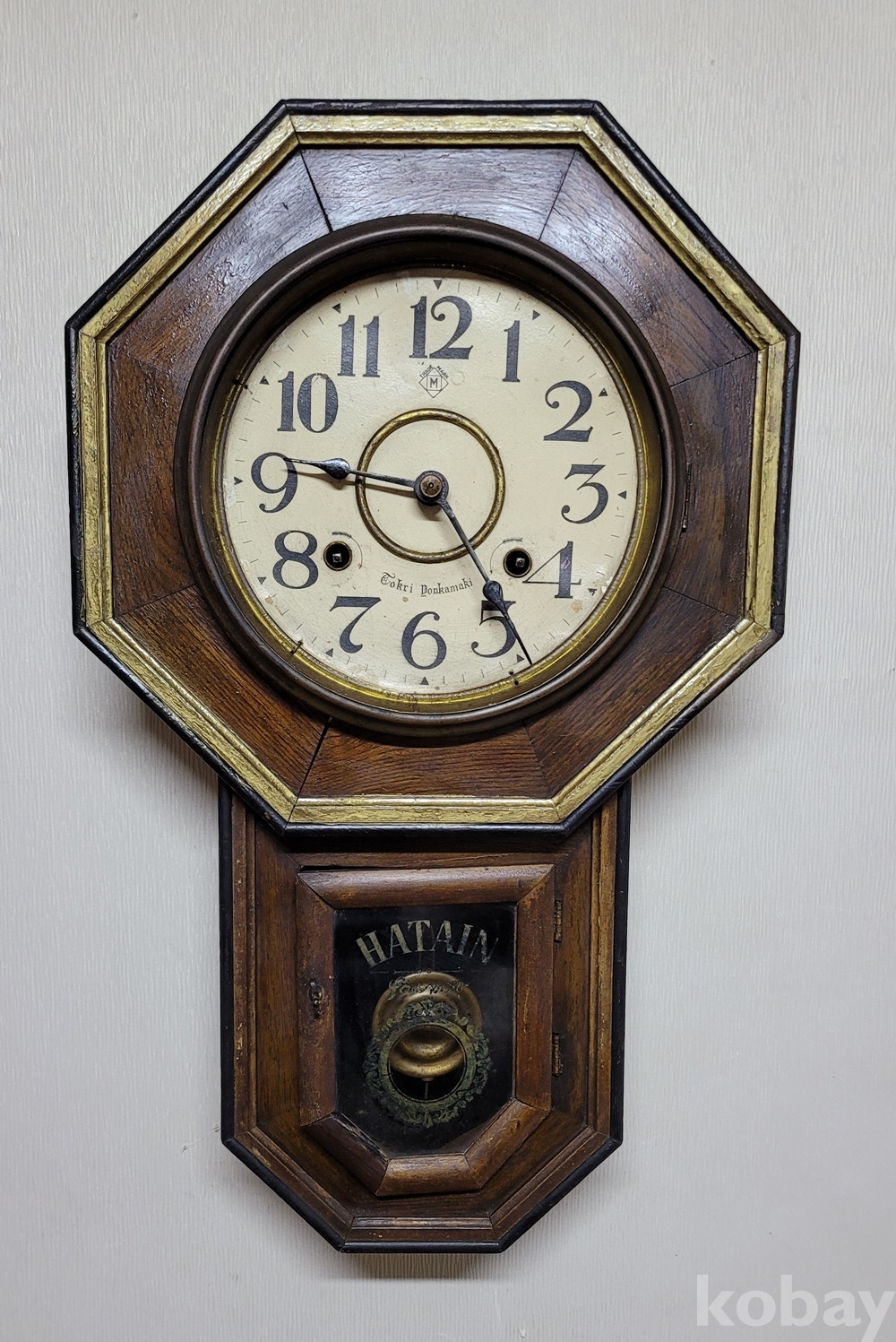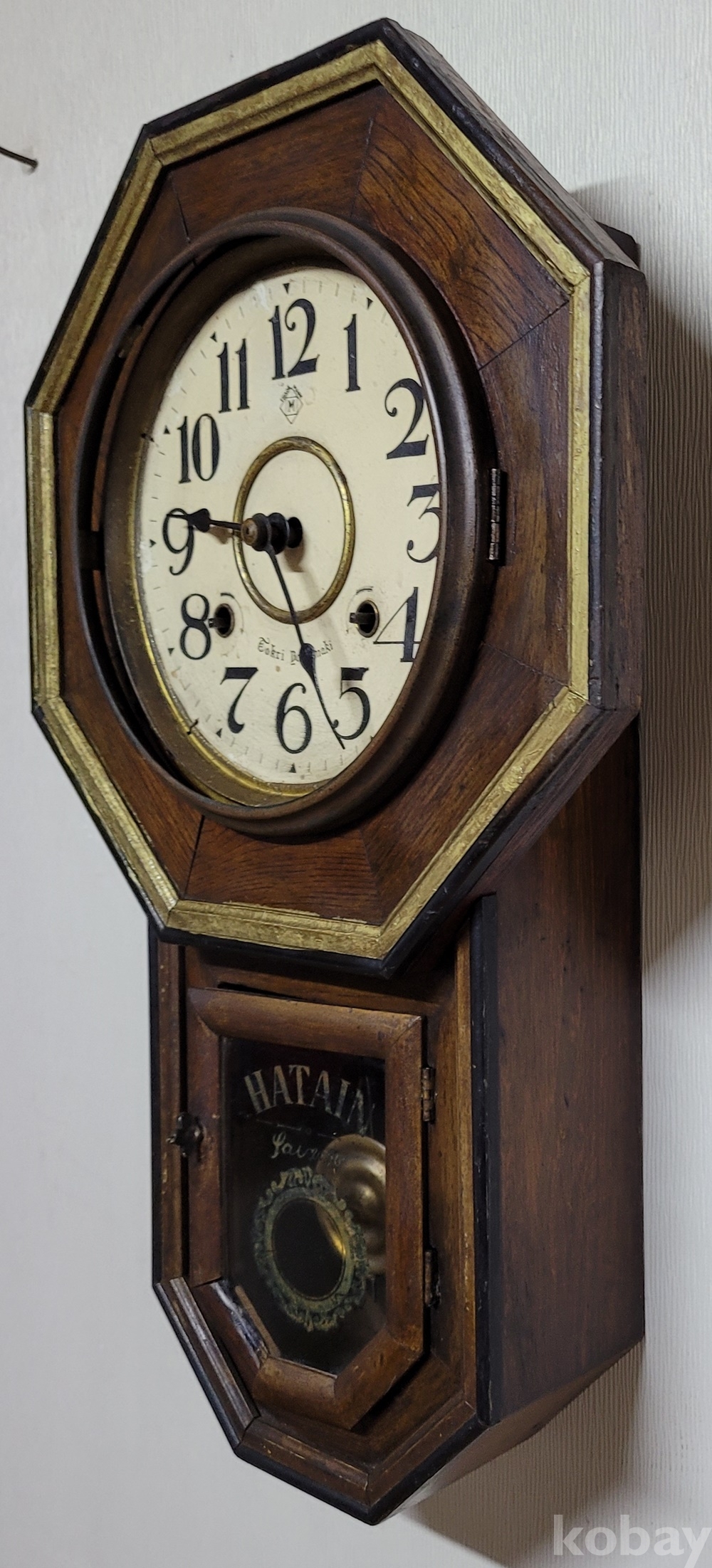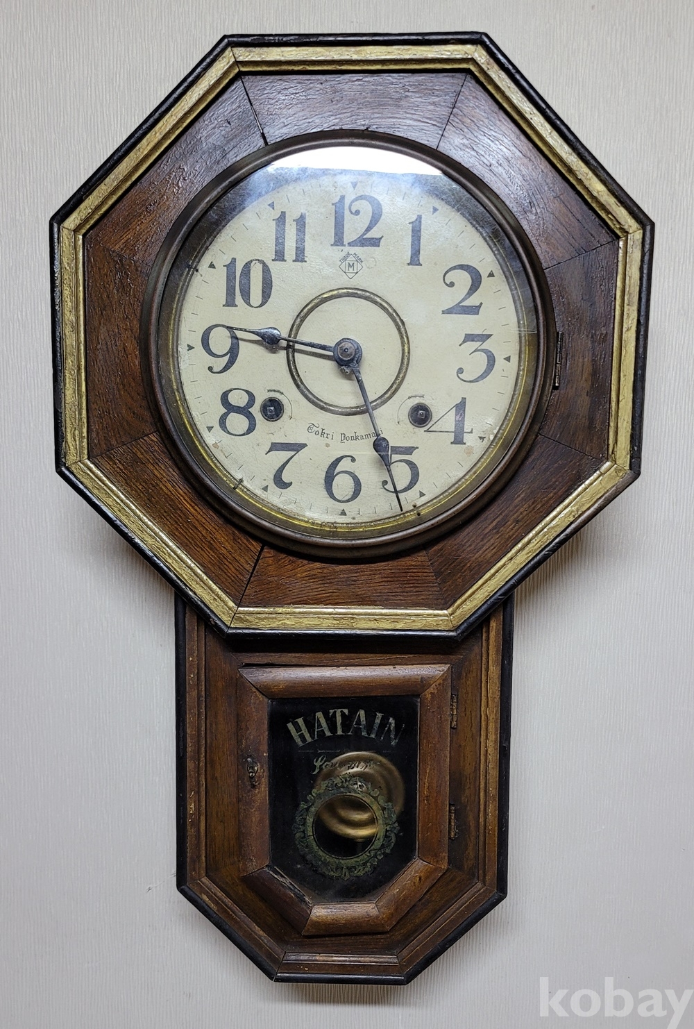 기계에 “SPECIAL SKILLFUL EXAMINED CLOCK HEARTH” 음각은 특수 전문가의 제작 검사된 제품이란 표시이고, 문자판에 “TRADE MARK M DOKEI DONKAMAKI”과 추문 창 유리에 “HATAIN” 각인들은 일본 유명 “MEIJI CLOCK CO 明治時計社”사용 문구임에 그곳 초기 제작으로 추정됩니다.