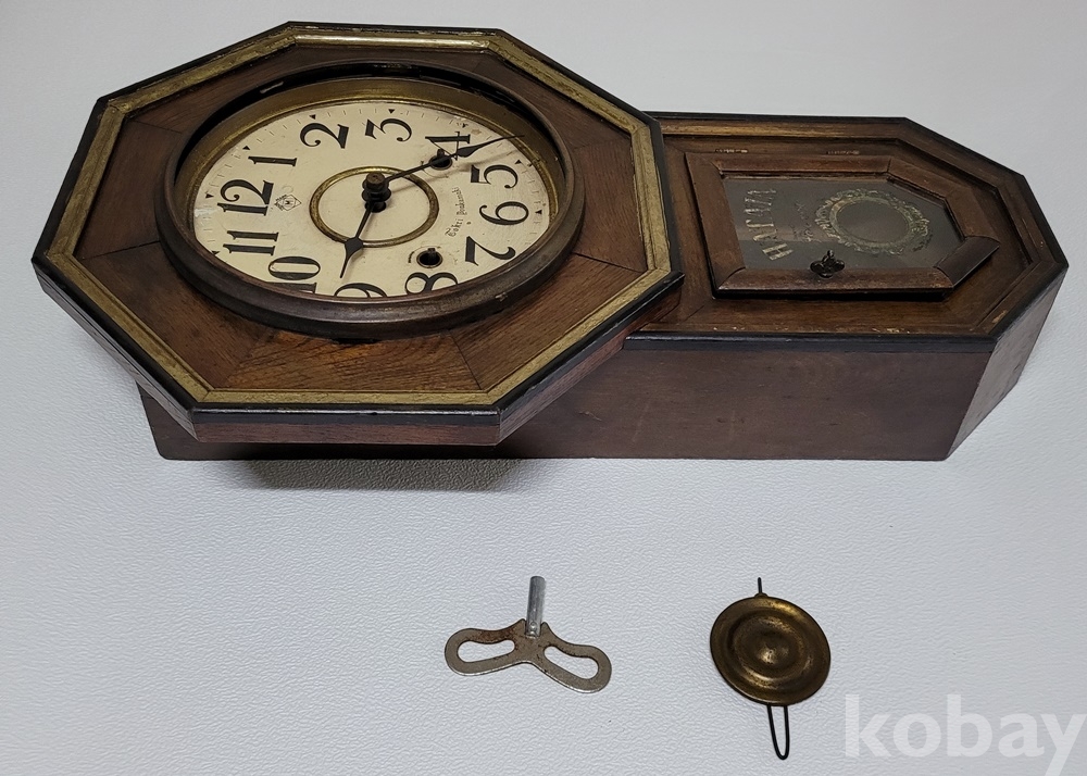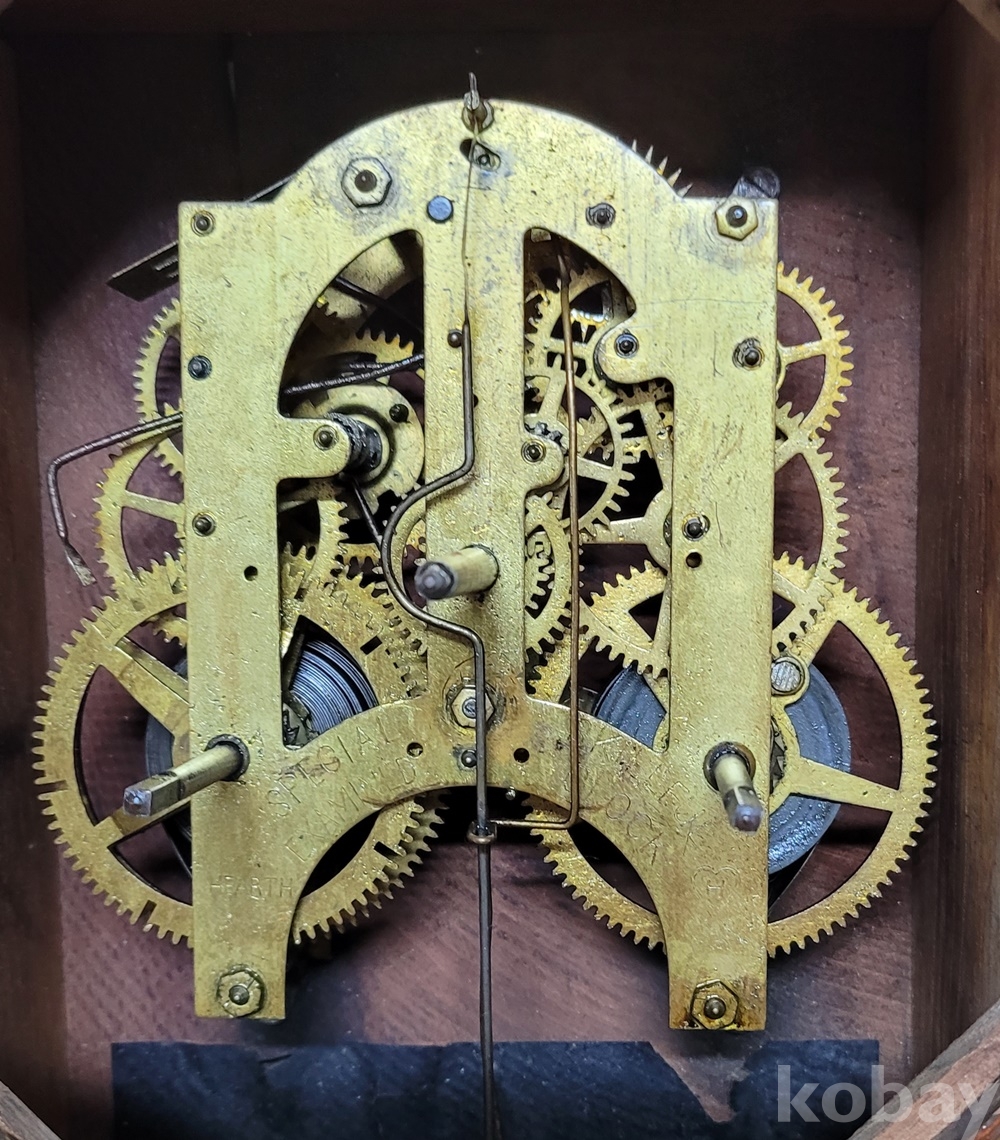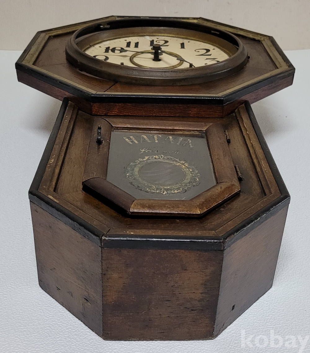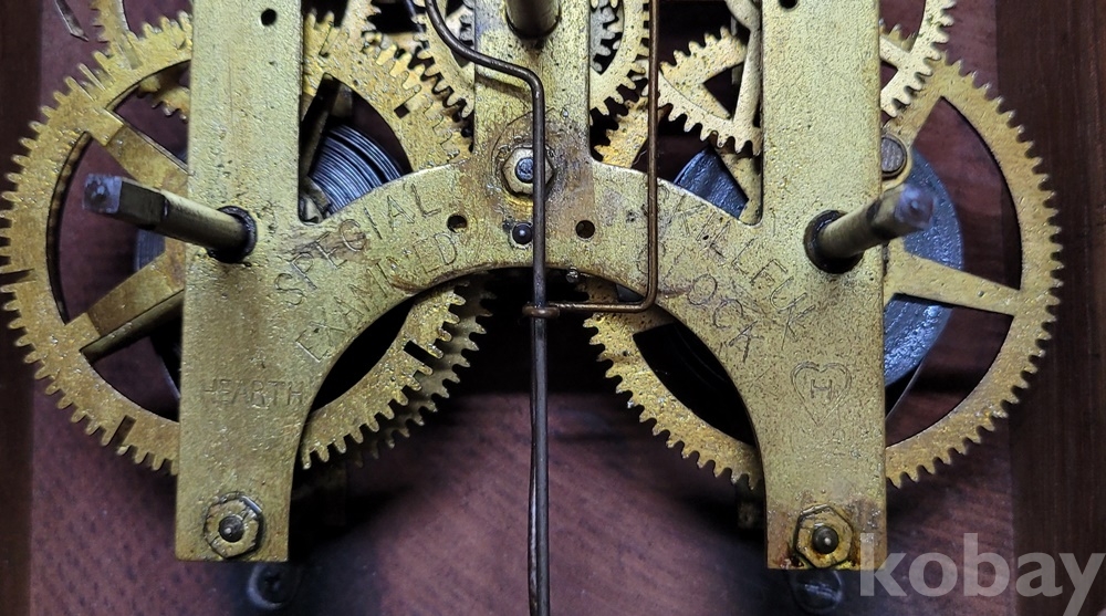 기계에 “SPECIAL SKILLFUL EXAMINED CLOCK HEARTH” 음각은 특수 전문가의 제작 검사된 제품이란 표시이고, 문자판에 “TRADE MARK M DOKEI DONKAMAKI”과 추문 창 유리에 “HATAIN” 각인들은 일본 유명 “MEIJI CLOCK CO 明治時計社”사용 문구임에 그곳 초기 제작으로 추정됩니다.
