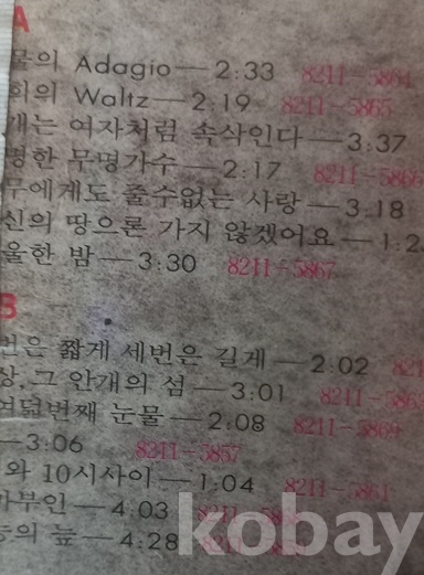 | 자켓상태 | G : 눈에 띄는 손상, 테이프, 필기 존재 | 음반상태 | EX : 재생에 영향 없는 가벼운 기스 존재 | 발매정보 | 알수없음 | 가사지여부 | 무 |