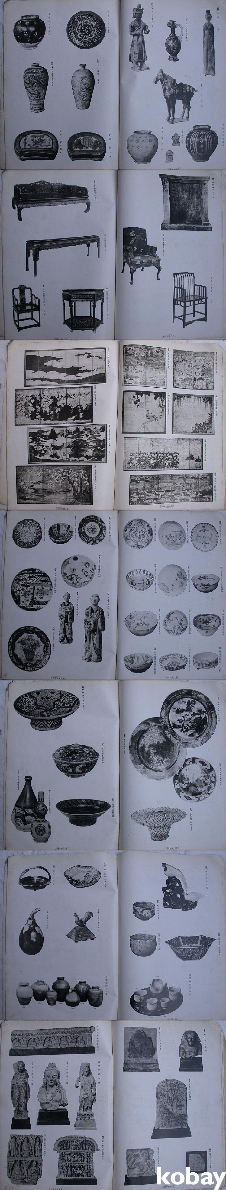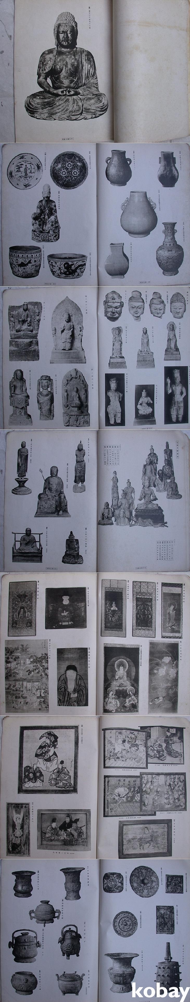 맨 먼저 '중요미술품'으로 흑백사진 <당석(唐石)보살반가좌상>, 채색사진으로 중국 상대의 동기와 금대 및 명대의 채색도자기 도판이 미농지의 간지를 앞에 두고 3장 이어지며, 본도록이 시작된다. 우선 흑백의 일본불상부터 명청대의 도자기와 수/당/육조 시대의 중국불상들, 송대의 보살상, 일본의 목조 홍법대사좌상들이 이어진다.