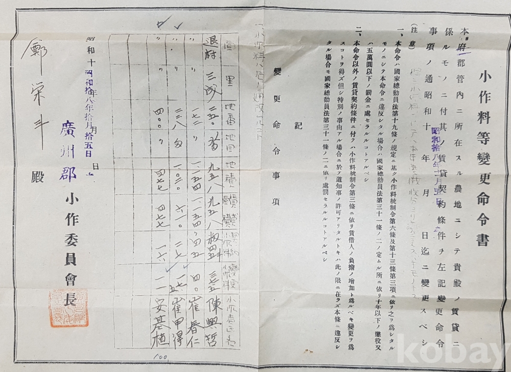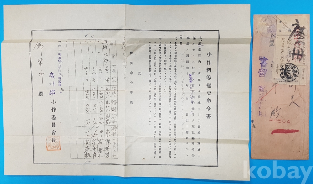 소화18년(1943년) 廣州郡小作委員會에서 경성부 거주 정영두에게 보낸 小作料等變更命令書