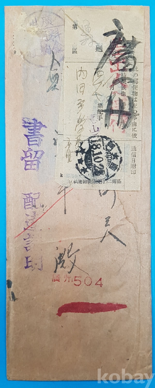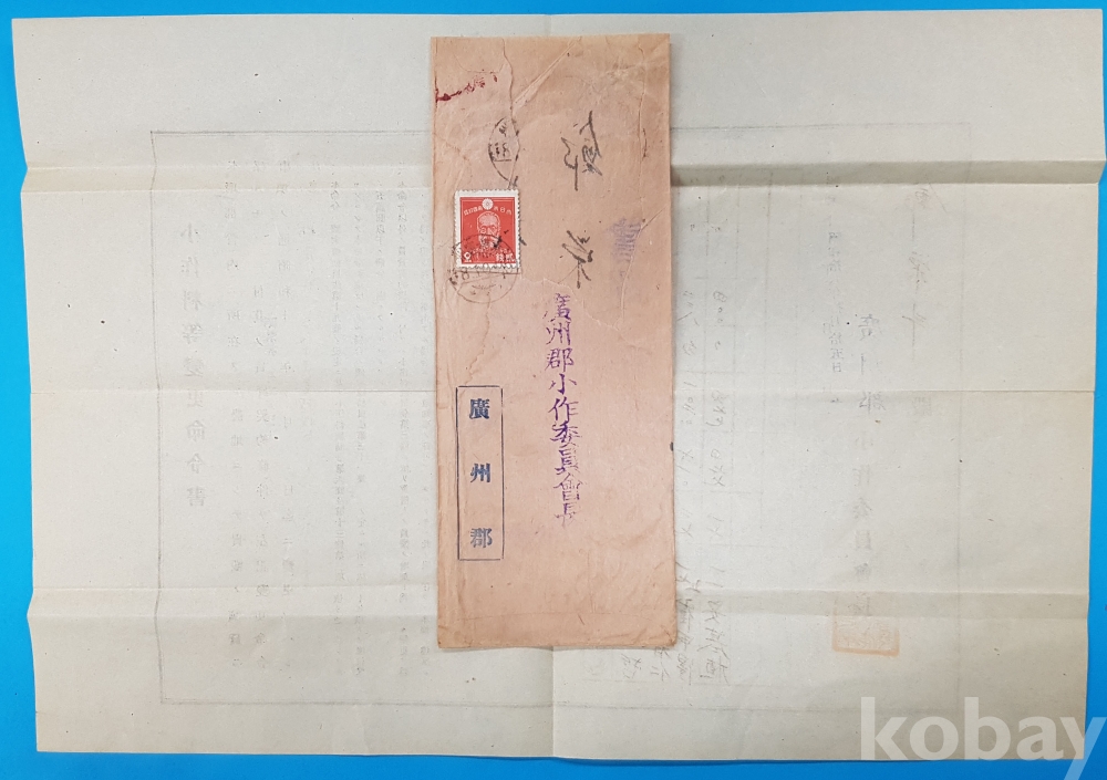 문서 및 배달증명 등기실체봉투. 廣州郵便局 요금별납우편 도장이 찍히고