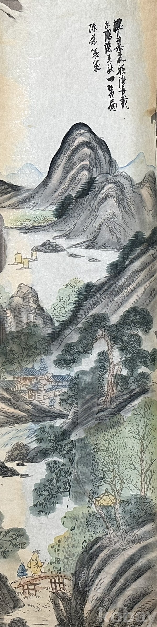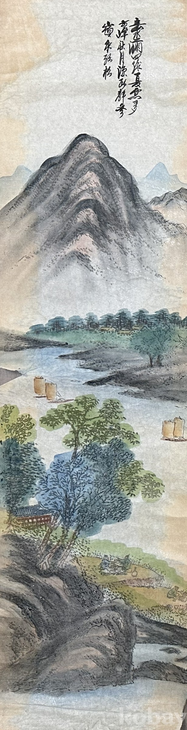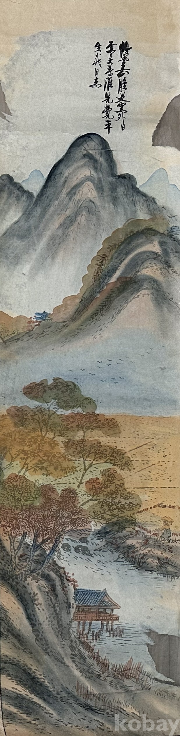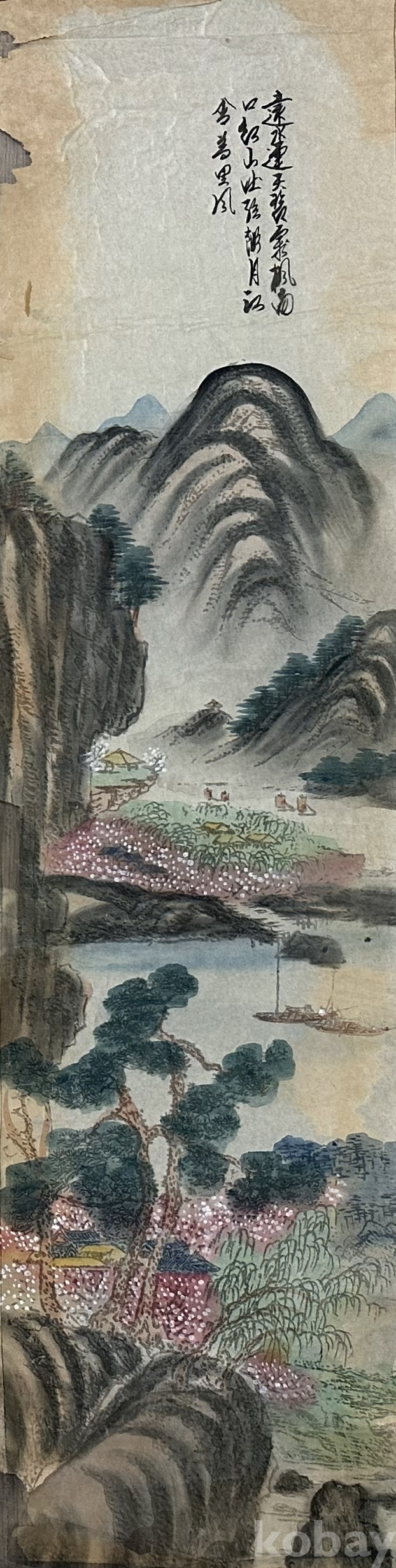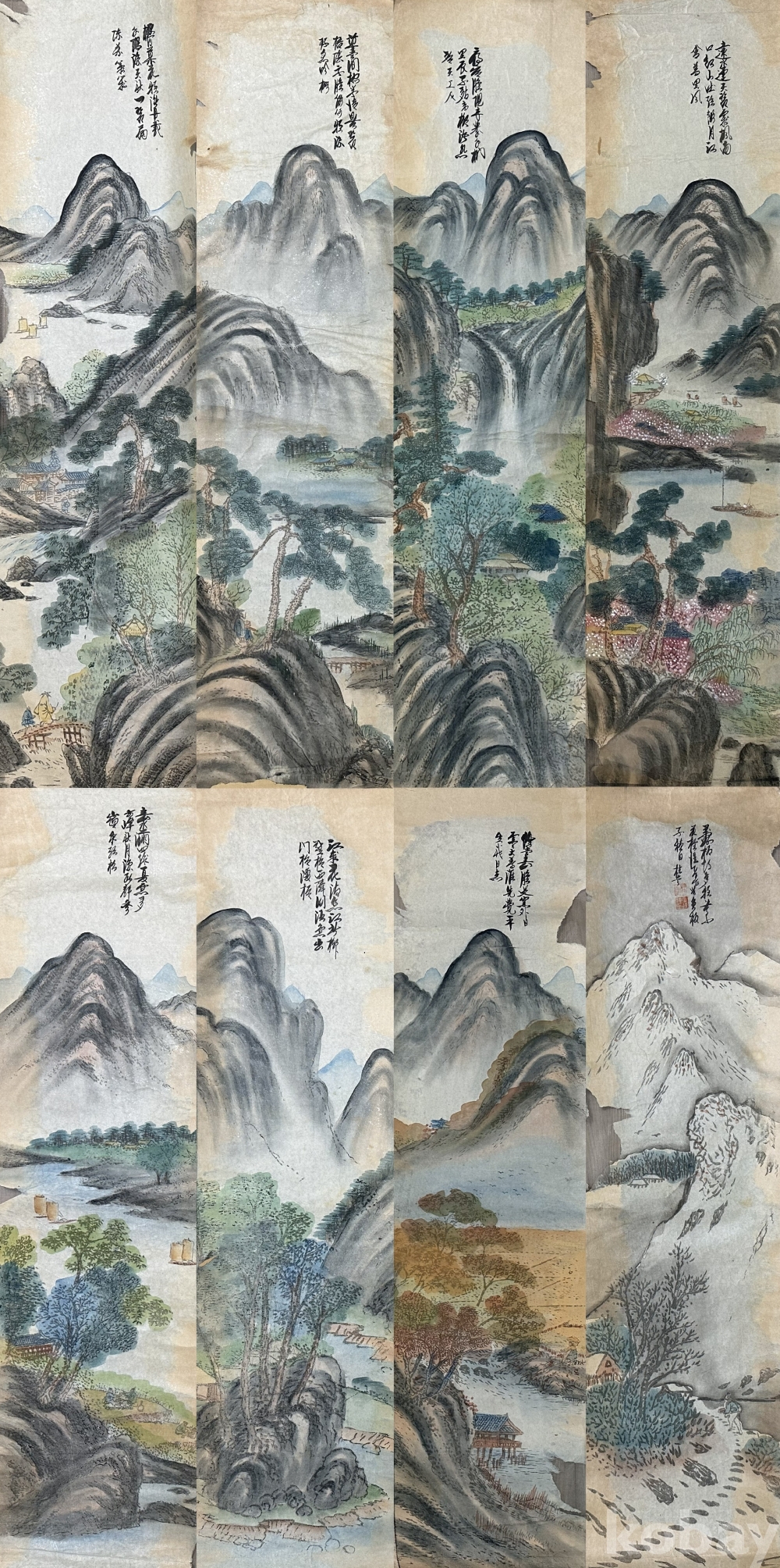 사계절의 산수와 풍경을 섬세한 필치로 담아낸 청록 산수화 8폭 일괄입니다. 산세의 표현과 인물, 가옥의 묘사가 꼼꼼하며, 청록색을 주조로 사용하여 장식성이 뛰어난 작품입니다. 원래 8폭 병풍으로 제작되었던 것을 보관상의 이유 등으로 해체하여 현재는 액자나 표구가 없는 낱장(종이) 상태입니다. 세월에 따른 얼룩과 가장자리 마모가 있으나, 그림 부분의 보존 상태는 양호하여 새롭게 병풍으로 표구하기에 좋습니다.