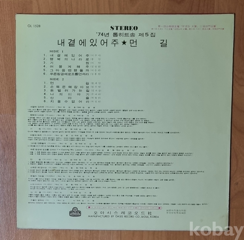 (귀한엘피) 오아시스 74년 톱히트송 제5집- 이수미,한세일 /내곁에 있어주/먼길