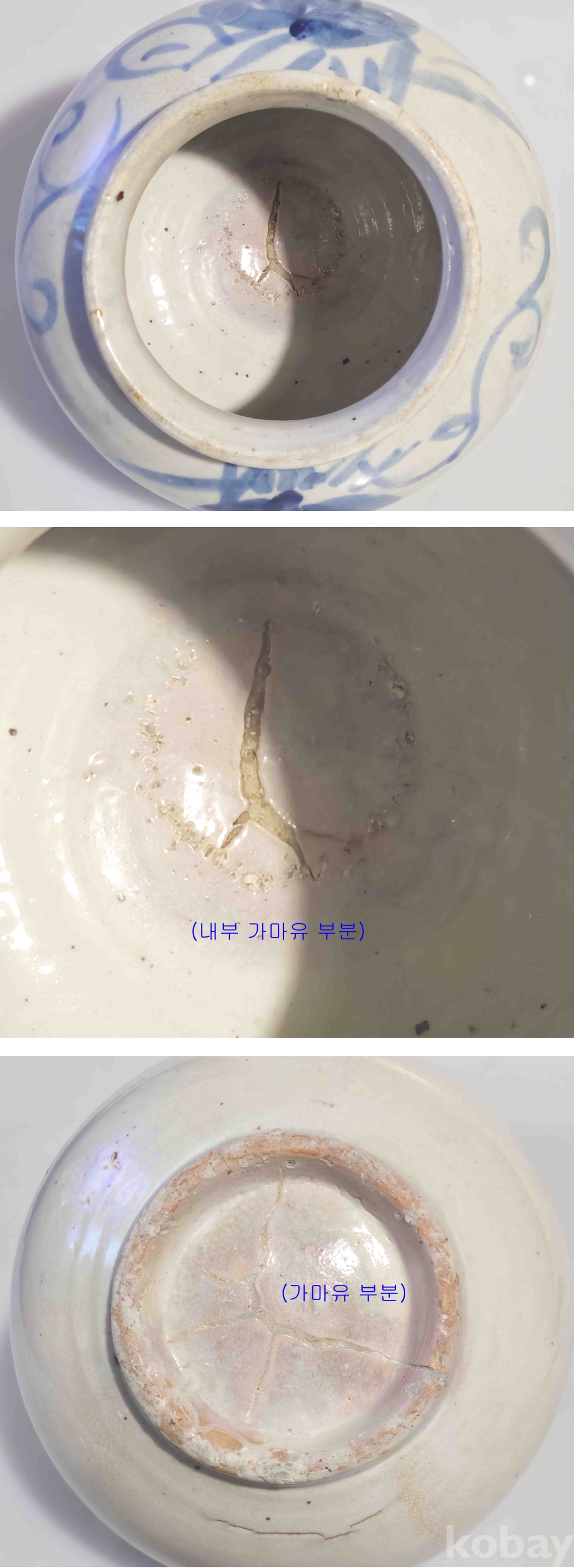 상품 설명 | 완전한 조선청화백자 포도넝쿨문 중형호. 상태 양호 합니다. 다만 밑굽에 가마유가 있습니다. 가마유를 실사용을 위해 오래전에 막은 흔적이 있습니다. 청화로 포도넝쿨을 2곳에 시문하여 기물의 격을 높였습니다. 참고로 사진은 확대한 상태이며 설명 못한 부분은 사진으로 대체합니다. 흔한 기물이 아니기에 소장의 가치가 높습니다. | ||