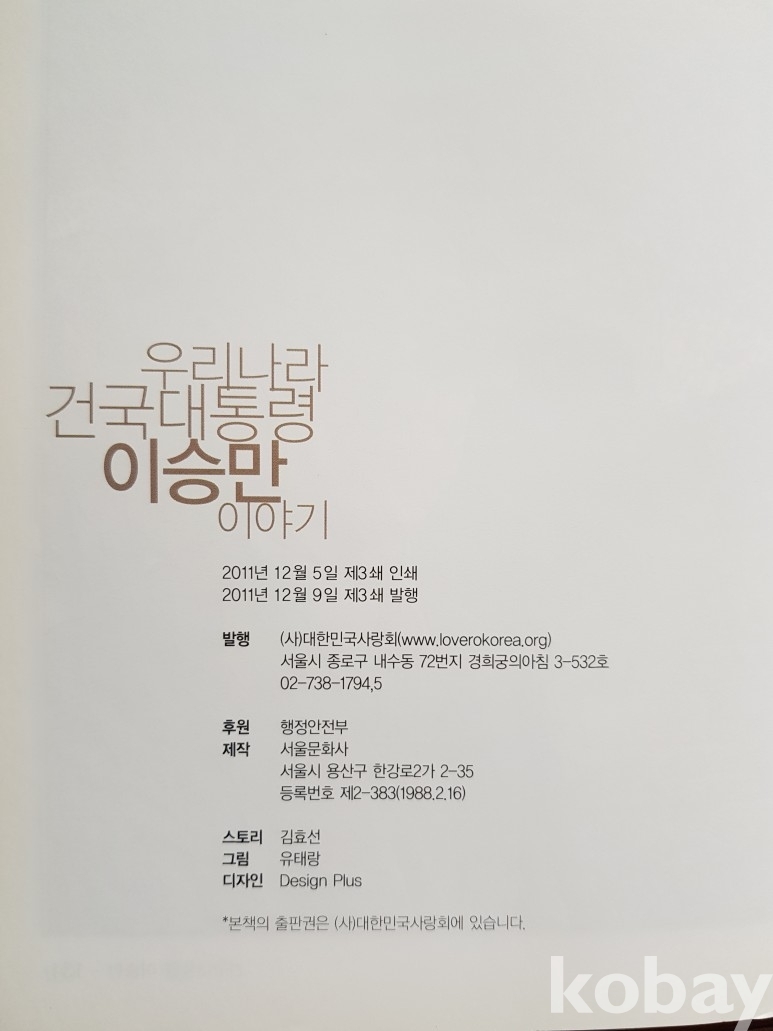 설명: 이 책은 대한민국사랑회에서 우리나라 대통령 만화를 발행한 것으로 이승만대통령 만화입니다
