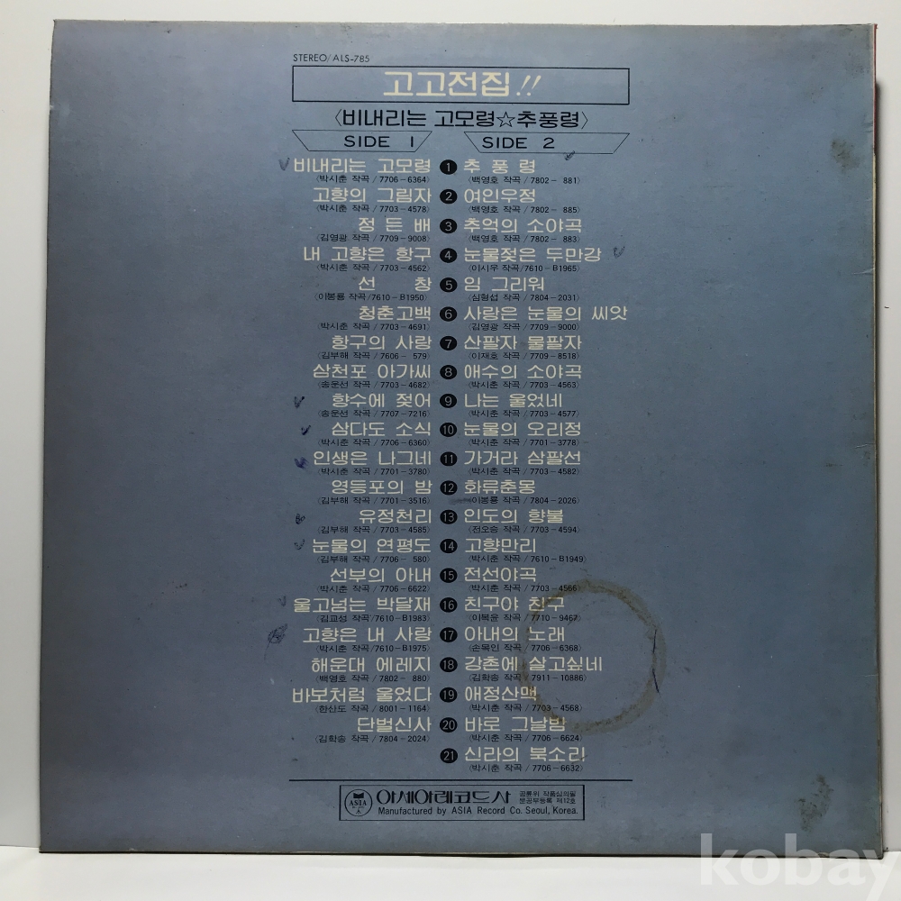 LP 85,100-9 고고 전집 - 비내리는 고모령/ 추풍령 자켓 EX 알판 VG+ 80 년 국내반