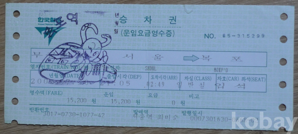 2000년 목포역 기념 일부인 서울 - 목포 무궁화호 승차권