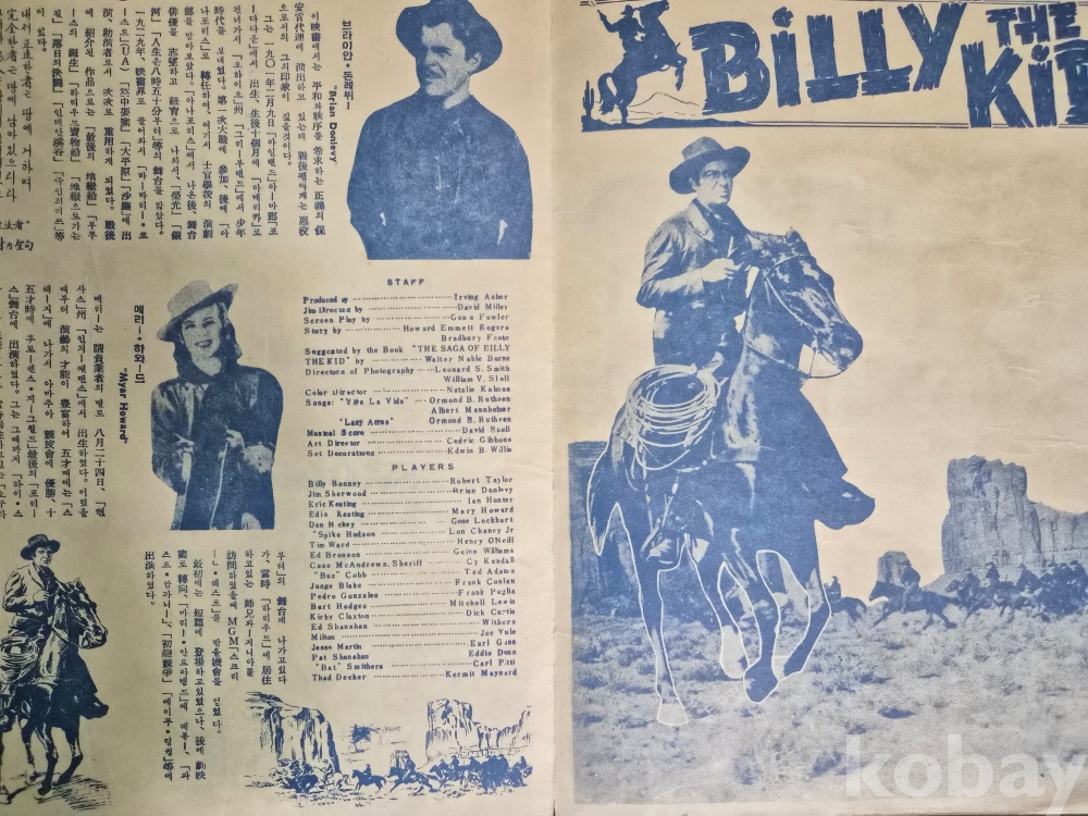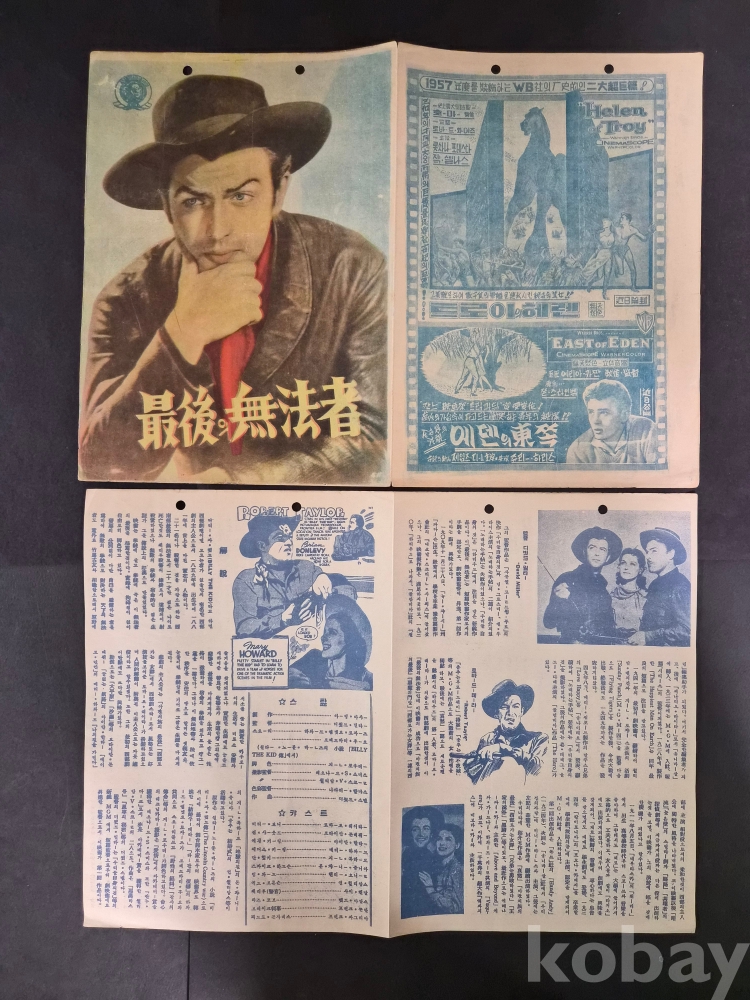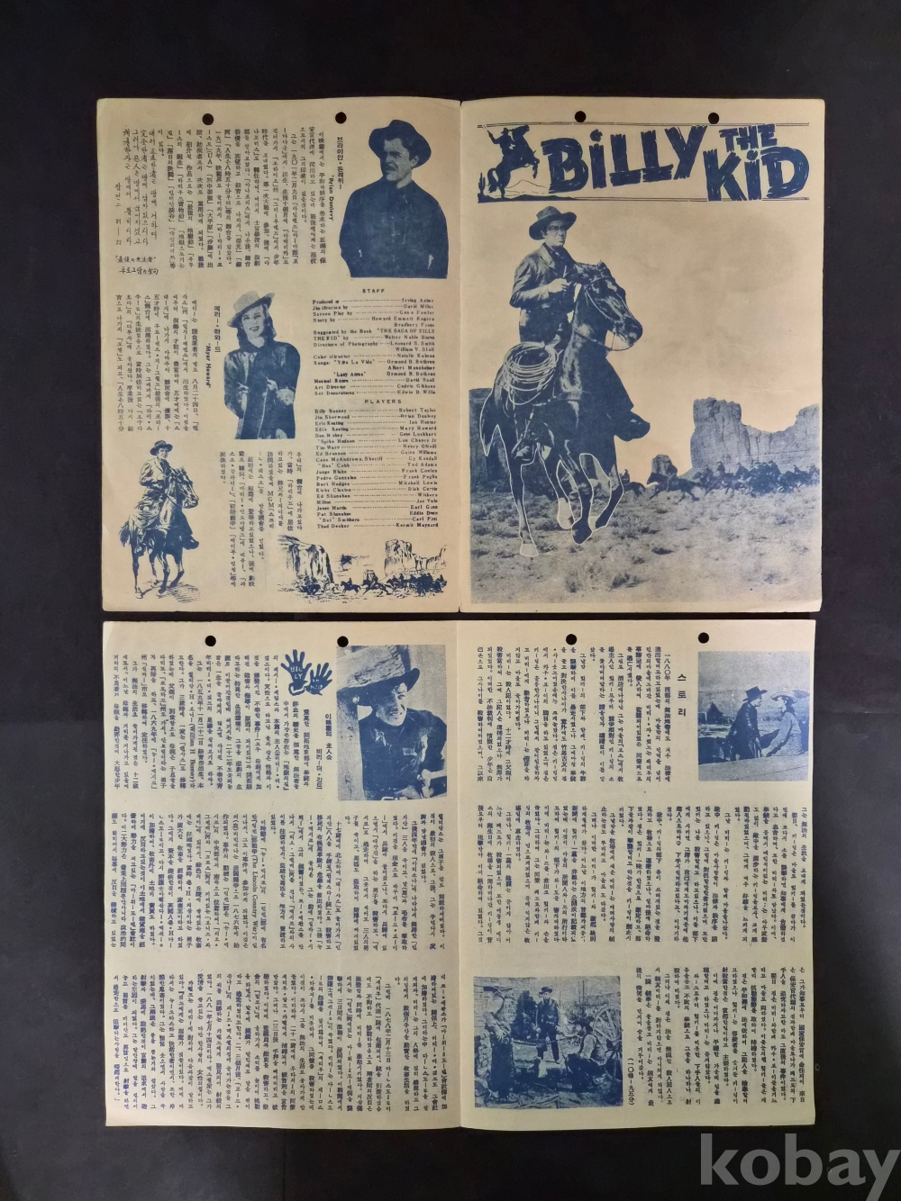 ☞전체 8면으로 이루어진 팸플릿 형 전단이다. 앞표지인 1면에는 빌리 더 키드 역을 맡은 로버트 테일러의 모습을 칼라로, 표제를 노란색으로 인쇄하였다. 2면부터는 모두 파란색 계열의 단색조로 인쇄하였다. 2면에는 영어 원제와 말을 탄 로버트 테일러의 모습을 담은 사진을, 3면에는 영화의 제작진과 출연진, 해설을 게재하였다. 4면에는 영화의 줄거리, 5면에는 “이 영화의 주인공 빌리 더 키드”라는 코너를 두고 실존인물 빌리 더 키드에 대한 소개를 실었다. 6면부터 면까지는 영화의 감독과 주연배우들의 약전을 게재하였다. 마지막으로 뒷표지인 8면에는 개봉예정작으로 <트로이의 헬렌(Helen of Troy)>와 <에덴의 동쪽(East of Eden)>을 소개하고 있다
