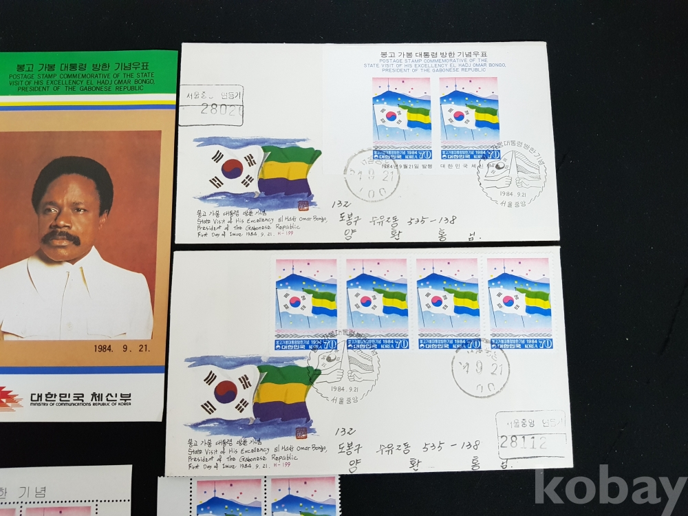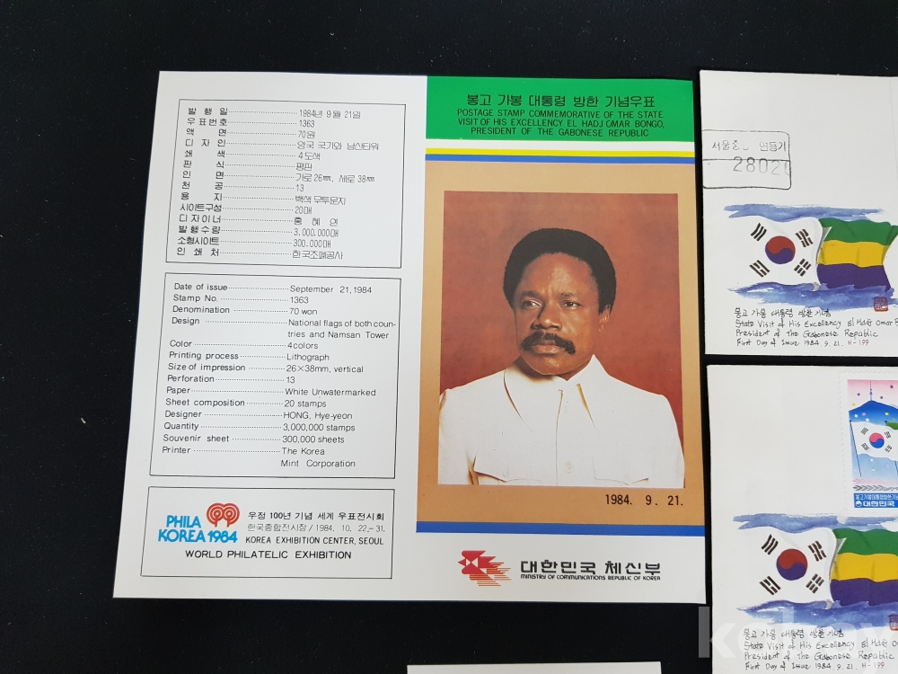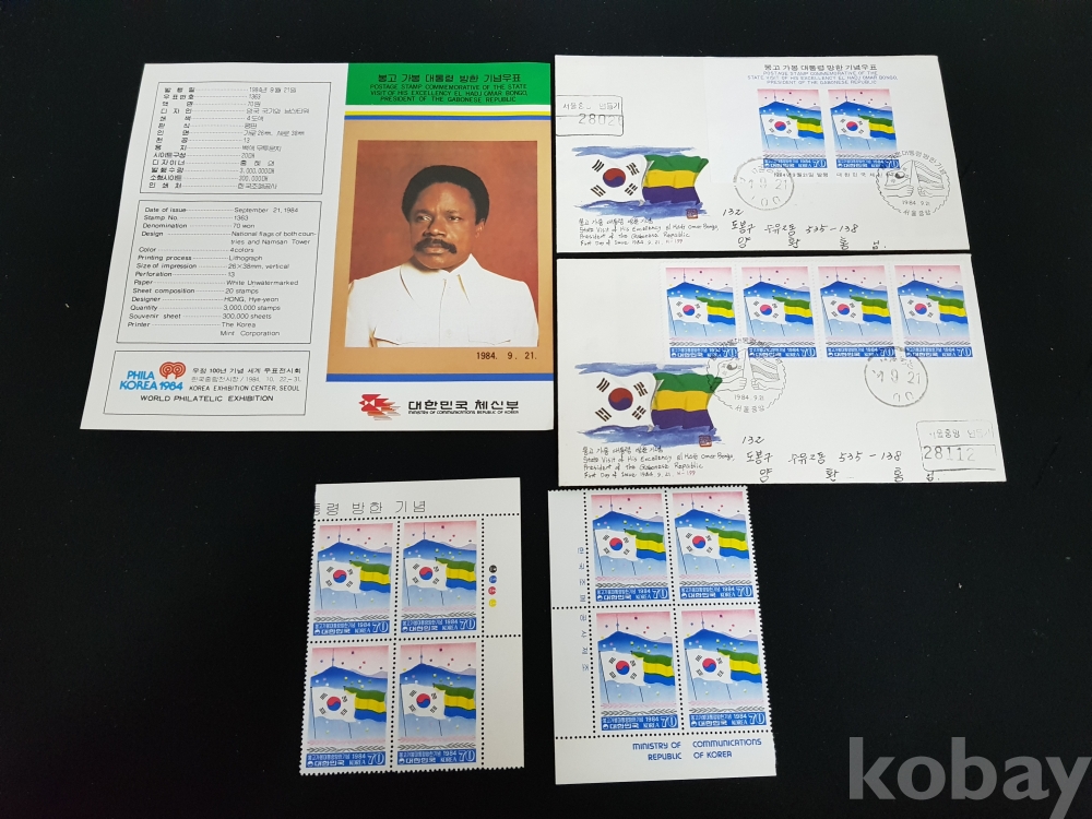 - 1984년 봉고 가봉 대통령 방한 안내카드, 초일봉피, 명판 등 모음