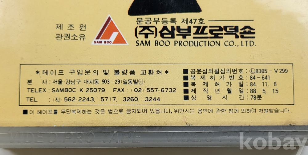 상 태 | 기획경매로 진행할 비디오테이프가 많아 재생여부 확인 불가 및 재생상태 확인 안함. 간혹 보이는 비디오테이프에 발생한 곰팡이들은 세월의 흔적으로 필요하시면 관련업체에 의뢰하시어 세척을 하셔야 합니다. 단, 흰색곰팡이는 리와인드로 한번 돌려주면 제거가 가능하나 검정색곰팡이는 세척을 하여도 화면재생이 안됩니다. 그래서 각각의 비디오테이프의 오염상태를 사진으로 올리오니 보시고 참고하여 주시고 상태가 안좋은 것은 화질의 질을 떠나 비디오테이프 그 자체의 존재에 소장 의미를 부여하시는 분들만 입찰하여 주시길 권유합니다. 부득이 반품신청시 사전에 판매자에게 미리 연락주시기 바랍니다. 비디오테이프는 재생하는 기계의 상태에 따라 화질이 다를 수 있는 등 분쟁의 소지가 많은 품목입니다. 사전 연락없이 반품신청시에는 입찰제한자로 등록하겠습니다. 훼손 및 오염 정도(강,중,약,양호로 표시합니다.) - 케이스 & 삽지 : 약~중 / 라벨 : 중(오염, 옆라벨 유실) / 테이프 : 약 / 곰팡이 : 양호 |