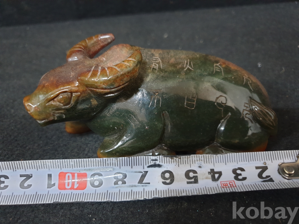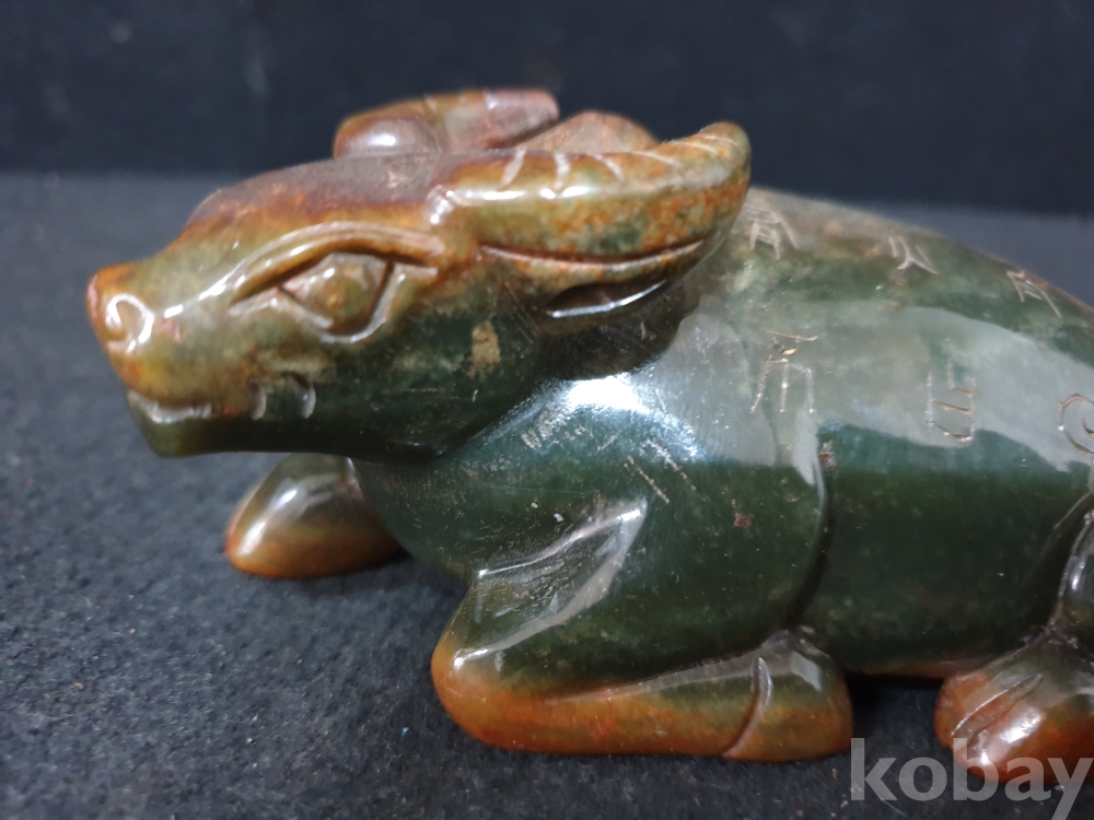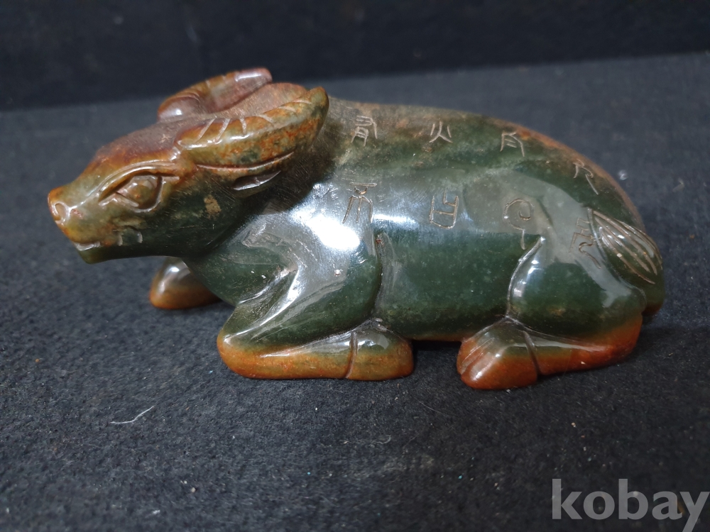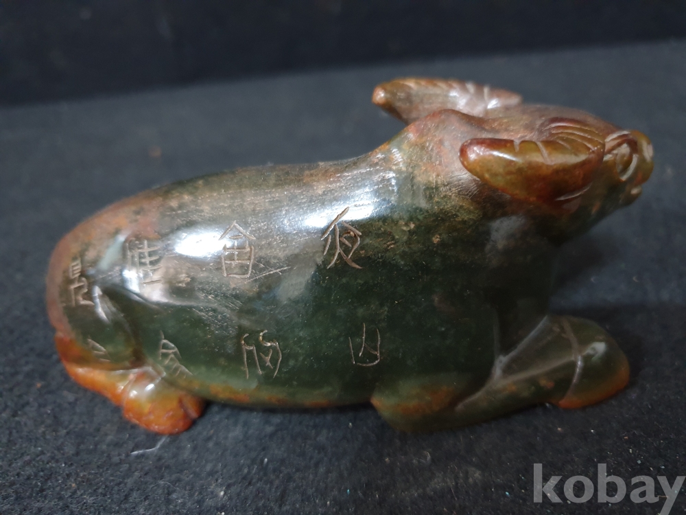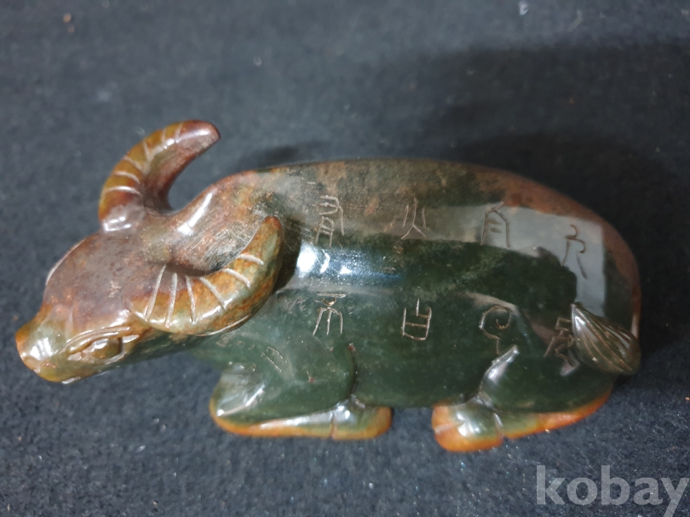 사이즈:높이:5.5센치.폭:12센치. 무게:398그람. 설명:이쁜 색상의 등에 명문글씨가 세겨져 있는 고급 화전옥 재질의 섬세하게 조각된 물소기형의 출토 춘추시기 고급 화전옥 물소상 옥기 입니다.상태 양호합니다.사진참고바랍니다.