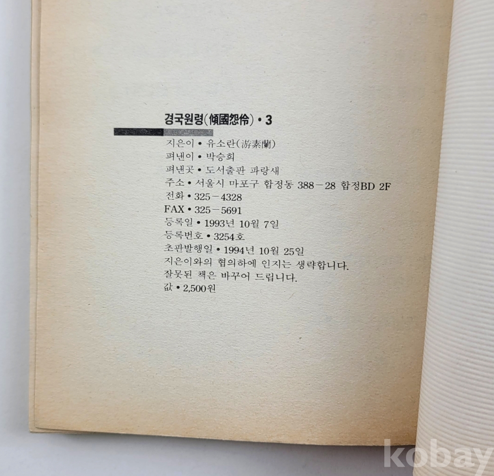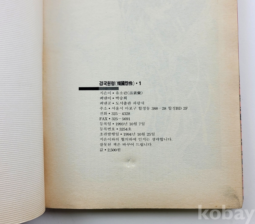 물 품 명 | 유소란 / 경국원령 (1,2,3,4)완결 총4권 / 1994년 초판 / 도서출판 파랑새 |