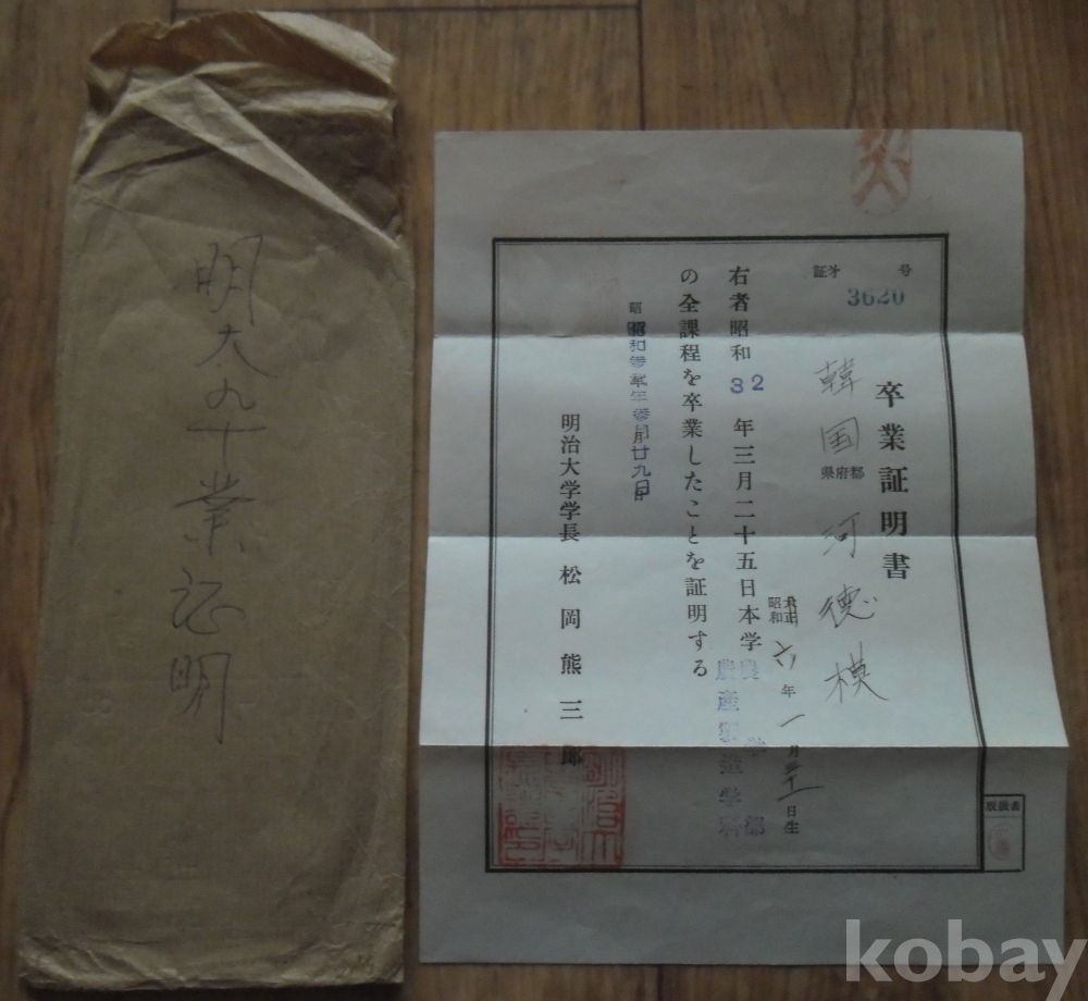 소화32년 명치대학 졸업증명서(재일교포 영주귀국)