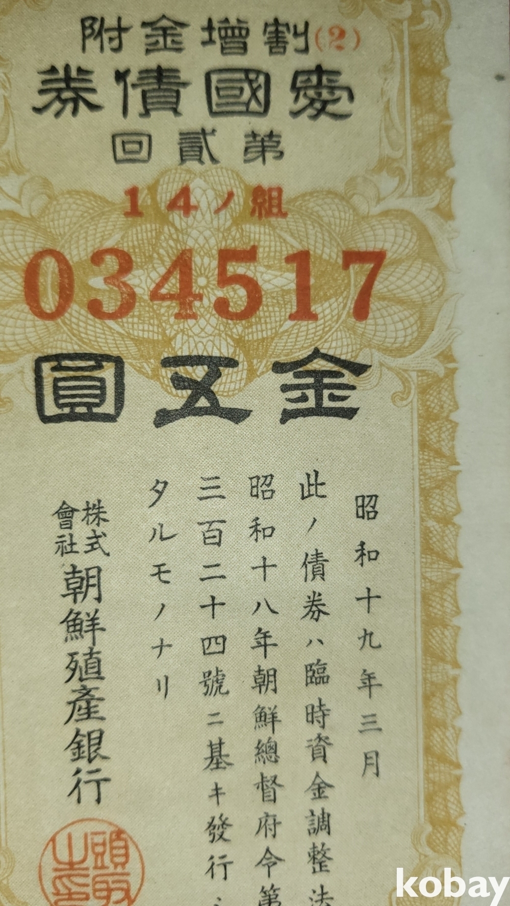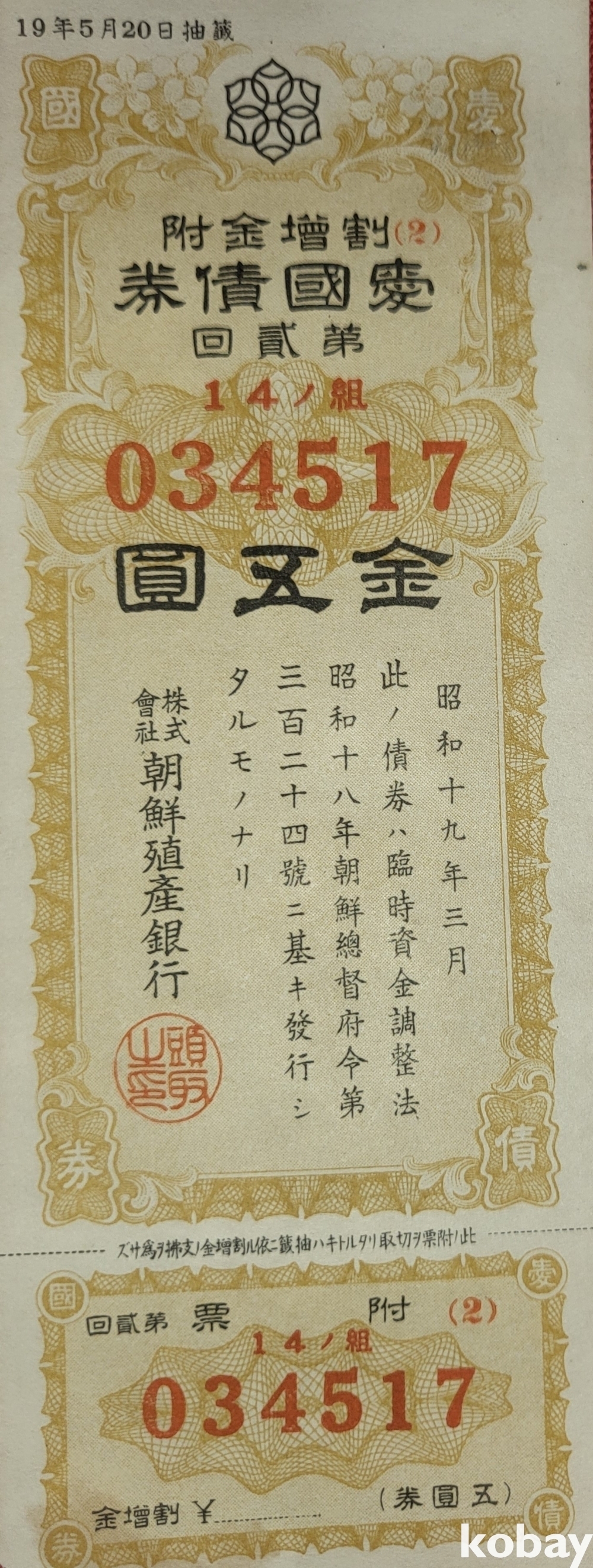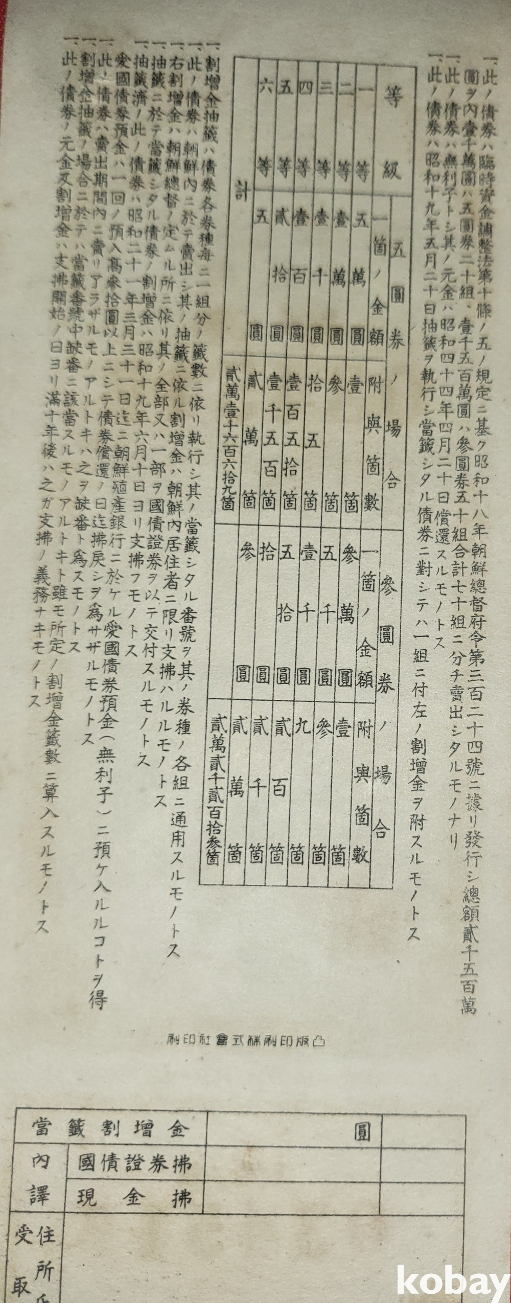 주식회사 조선 직산은행 소하19년(1943년) 발행된 할증금부(割增金附)입니다,