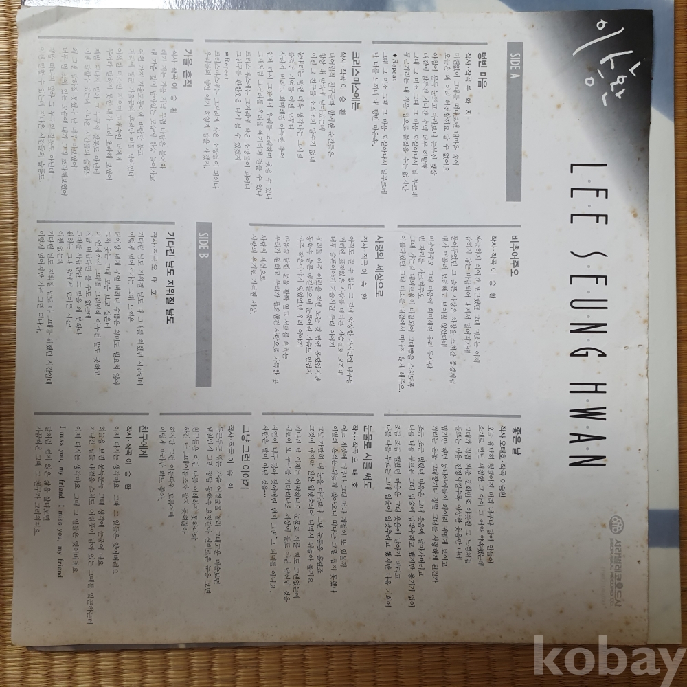 | 자켓상태 | EX : 약간의 마모, 모서리 찢김 존재 | 음반상태 | EX : 재생에 영향 없는 가벼운 기스 존재 | 발매정보 | 알수없음 | 가사지여부 | 유 |