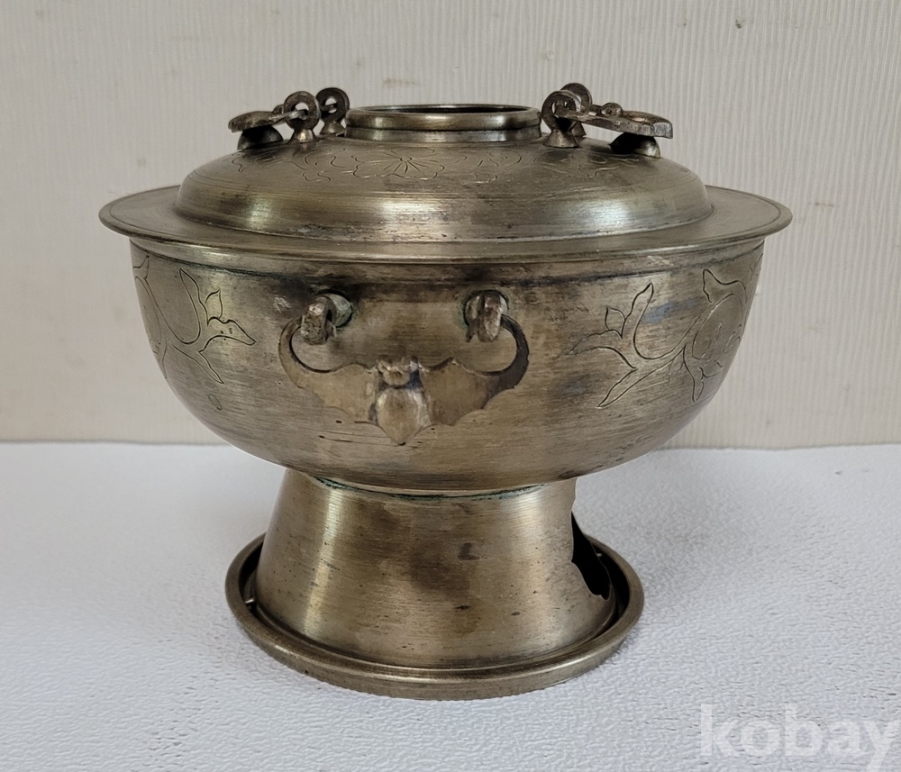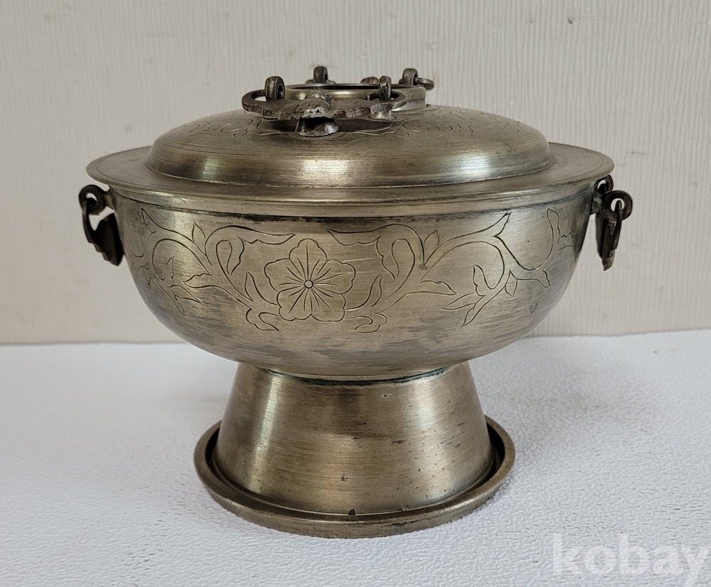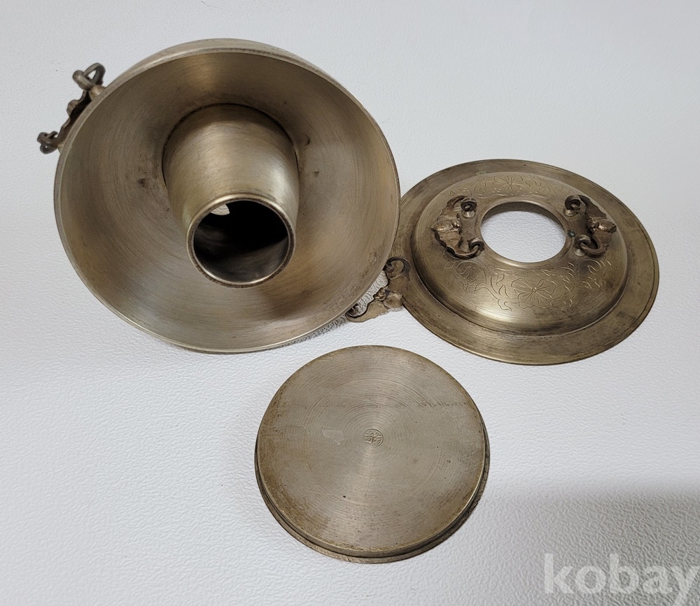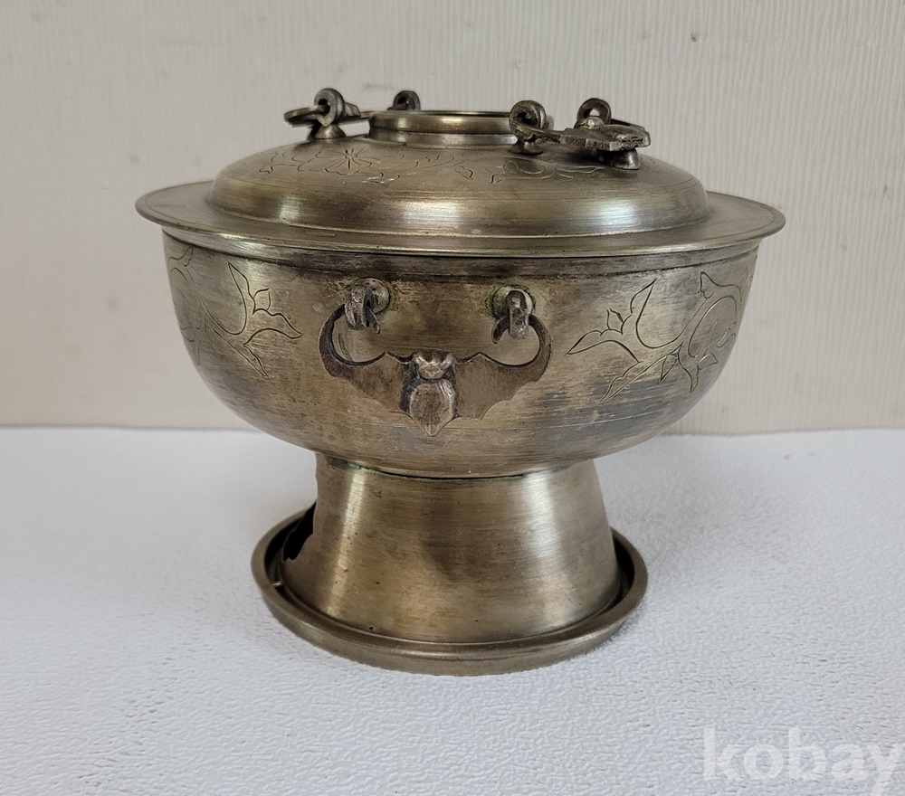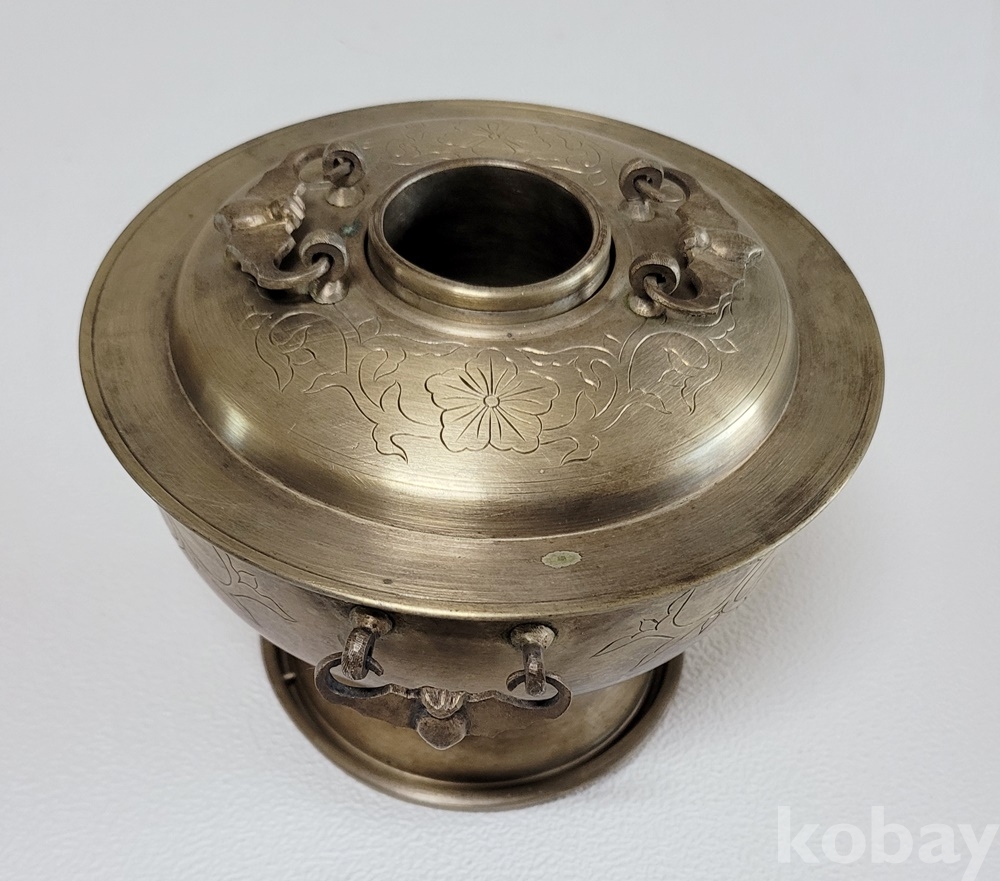 덮게 몸통 받침 3단 분리에 손잡이는 박쥐형이고 덮게 몸통은 이왕가 미술품에서 애용되는 당초 문양이 음각되어 있으며 약간 소형으로 예쁜 크기입니다.