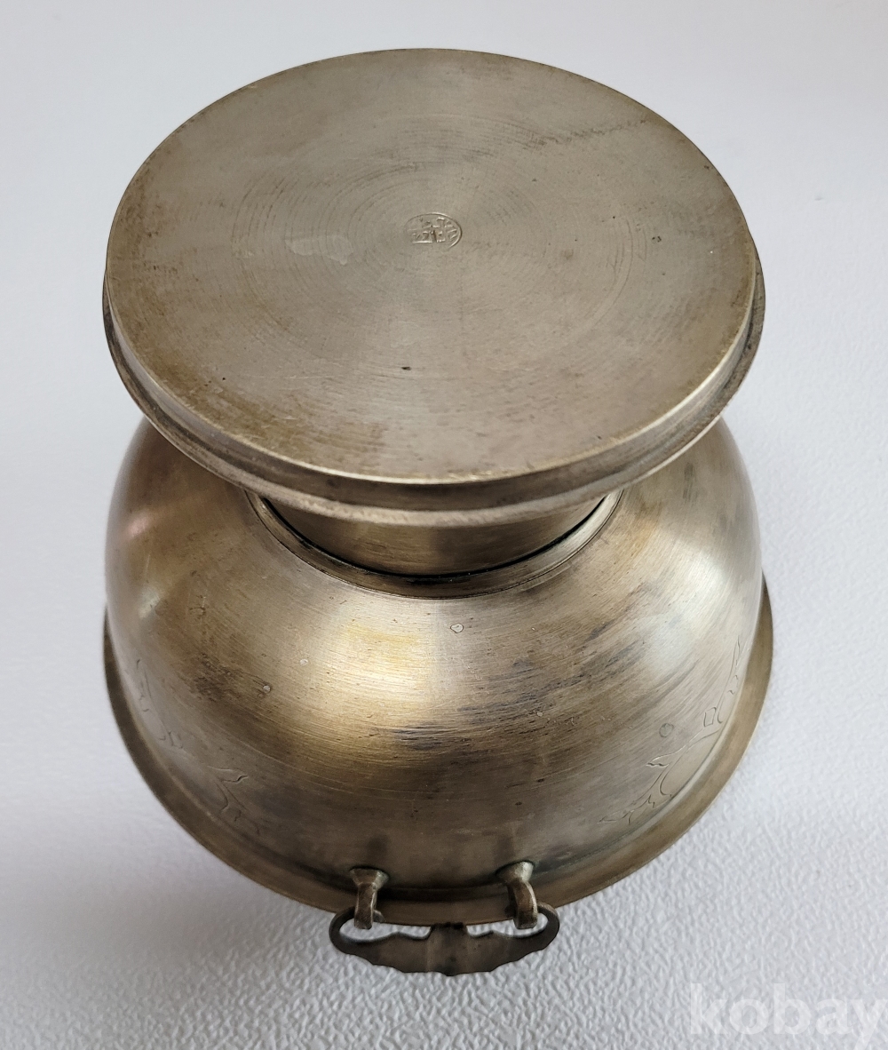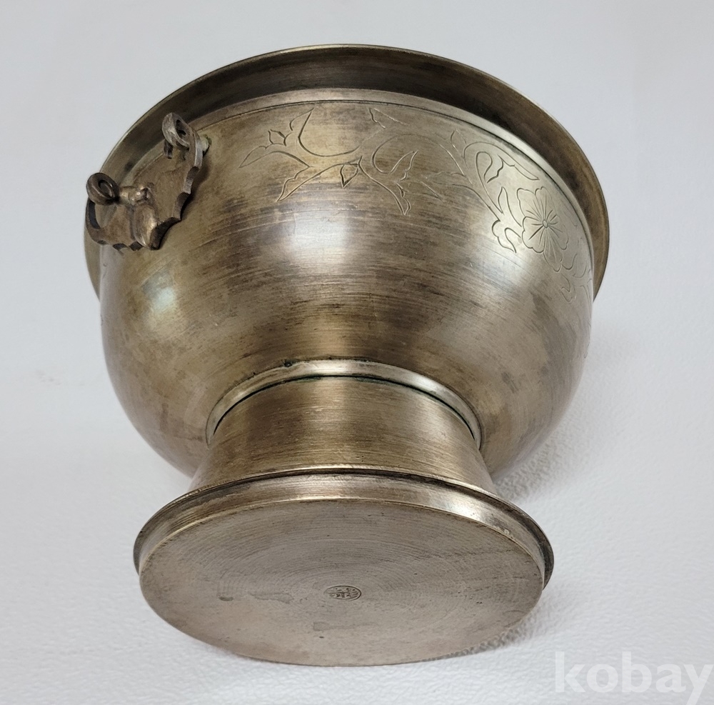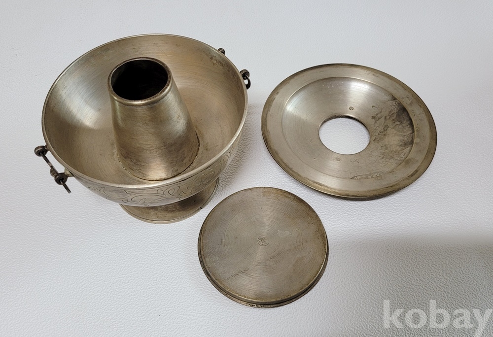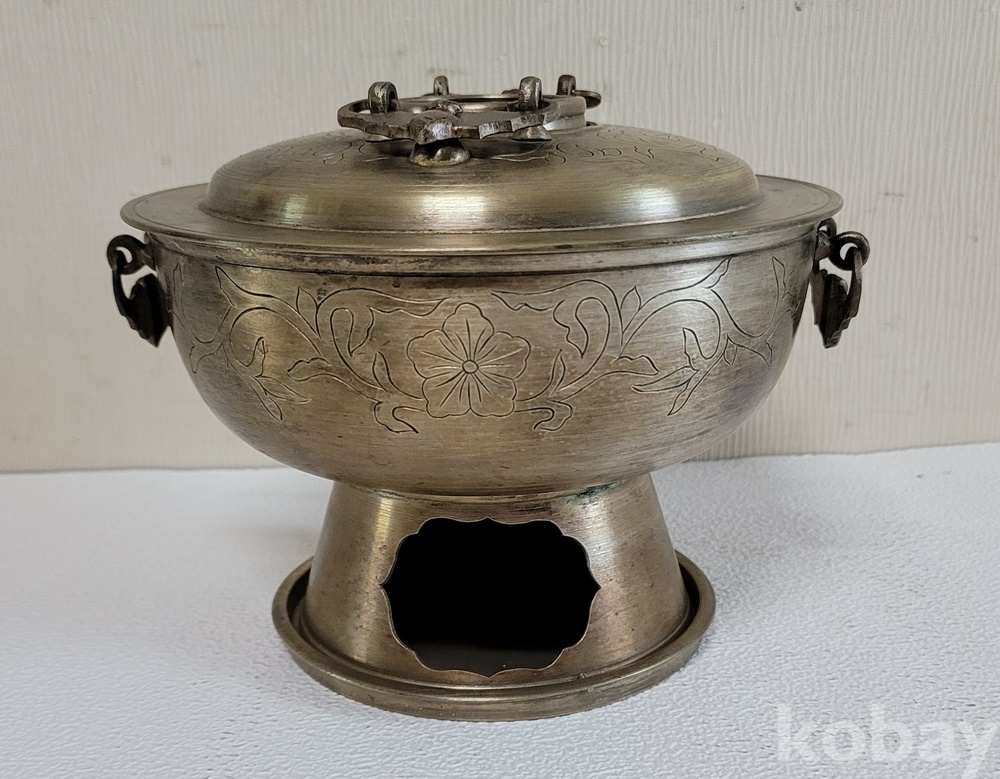 덮게 몸통 받침 3단 분리에 손잡이는 박쥐형이고 덮게 몸통은 이왕가 미술품에서 애용되는 당초 문양이 음각되어 있으며 약간 소형으로 예쁜 크기입니다.