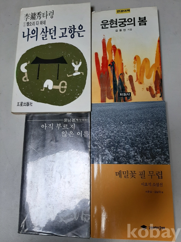 1. 아직부르지 않는 이름-윤남경 에세이 1977년초판 평민사 발행 증정본2. 운현궁의 봄-김동인 저 1990년2판 학원사 발행3. 메밀꽃 필 무렵-이효석 소설 2005년초판 강원대학교 출판부 발행4. 나의 살던 고향은-이종수 저 1985년초판 오성출판사 발행5. 진달래꽃-김소월 저 1986년초판 글방문고 발행6. 어둠속의 투명한 노래들···· - 전문화 시집 1993년초판 광미사 발행7. 님의 침묵-한용운 시집 1991년재판 동하 발행 반품불가, 반품시 반품비용 구매자부담조건 판매,사이즈는 정확하지 않음
