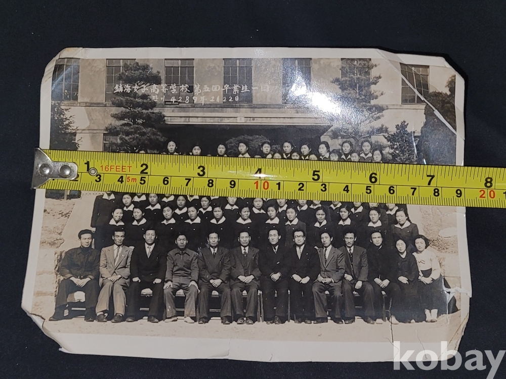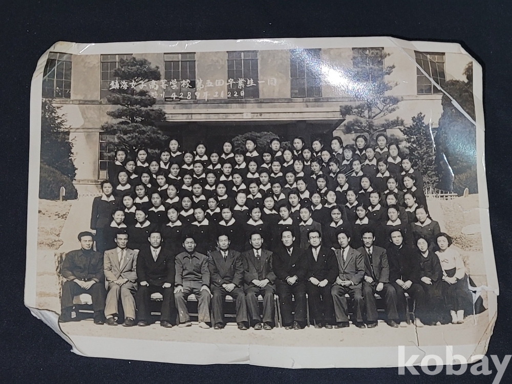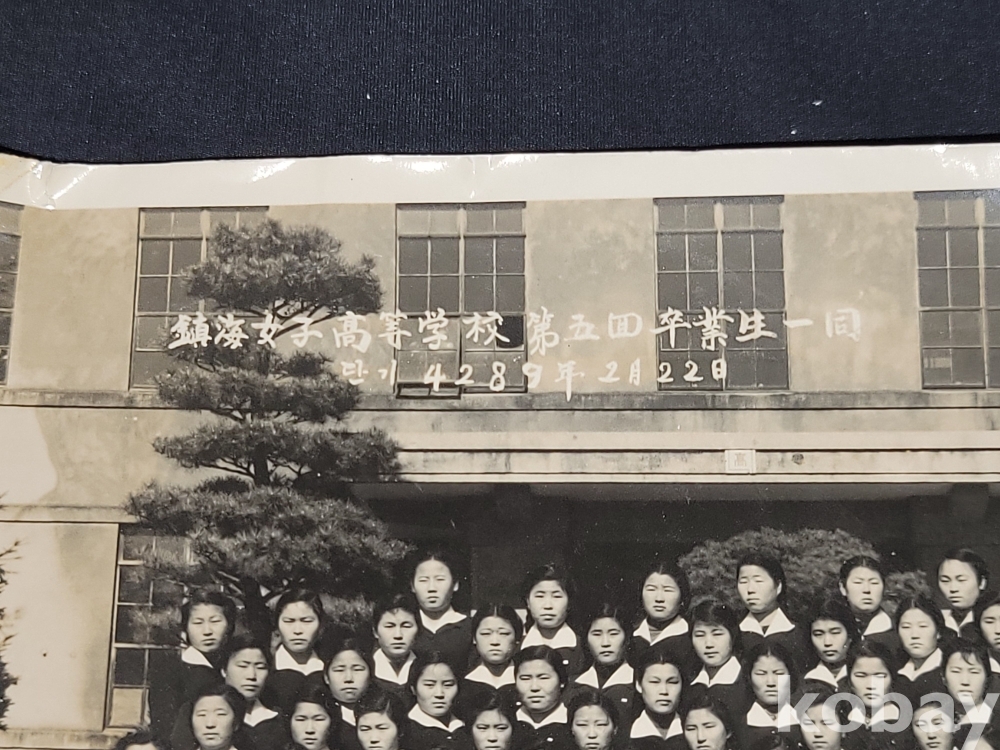 빈티지 세월 감이 느껴지는 1956년 진해여자고등학교 제5회 졸업 기념 단체 흑백사진입니다.
