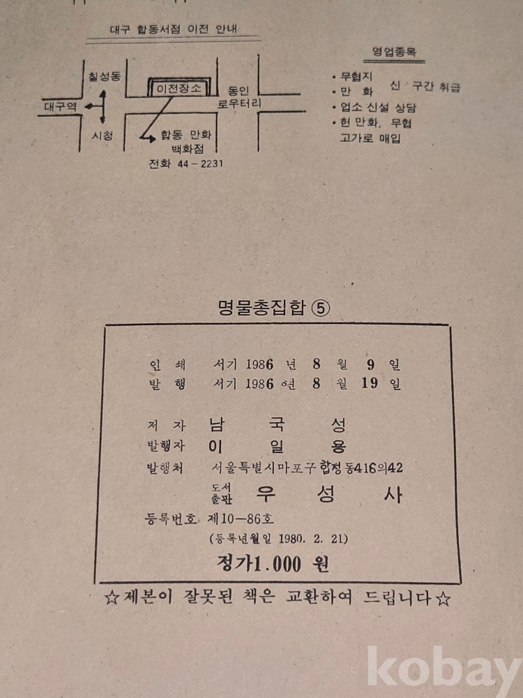 추억의 만화방 ==만화문고 시리이즈 == 1986년 발행 / 남국성 글.그림 = 명물총집합= 5권 완질