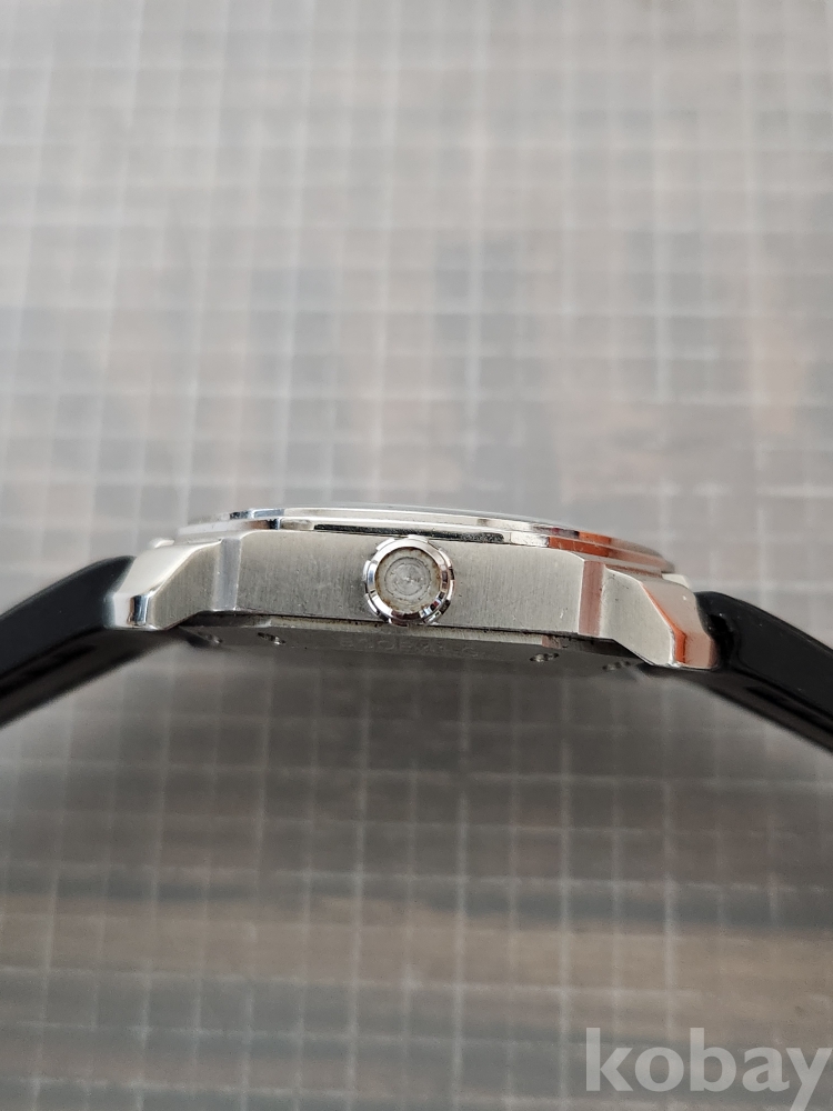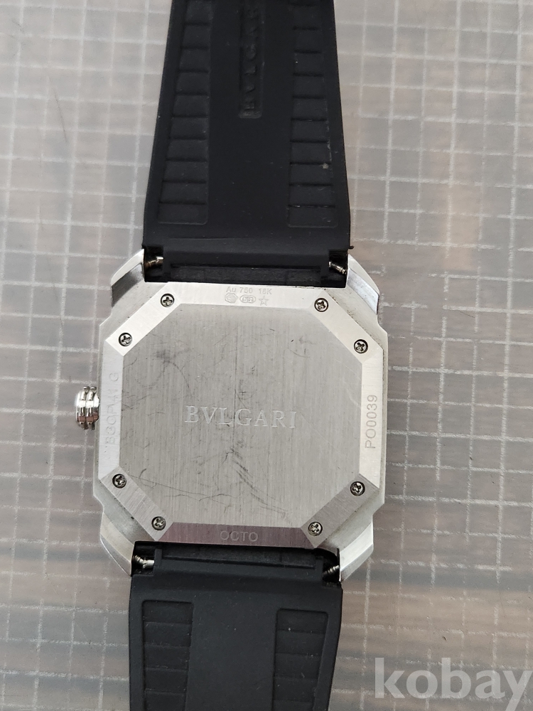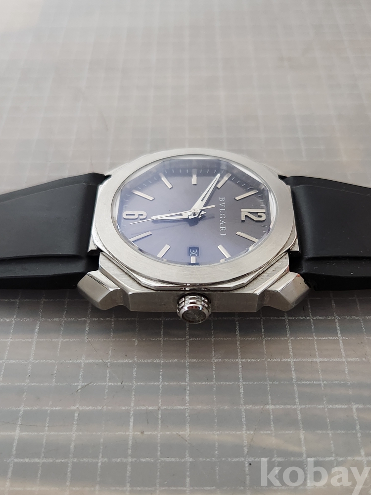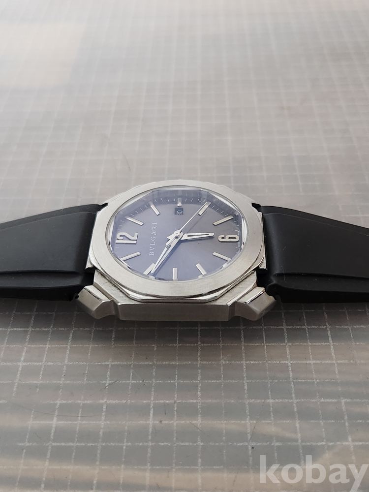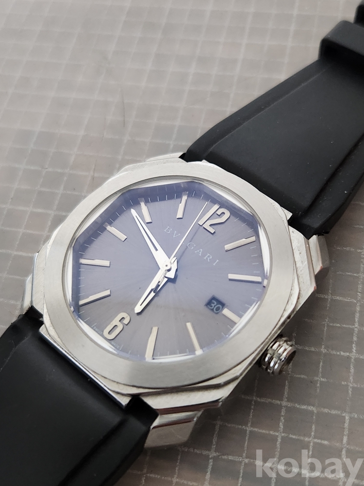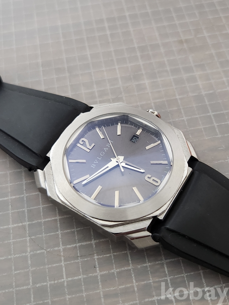 (땡처리) 불가리 옥토 모델입니다. 날짜 표시 기능이 있으며, 블랙 러버 스트랩이 특징입니다. 세련된 디자인으로 다양한 스타일에 잘 어울립니다.