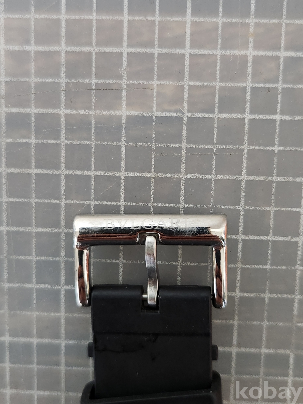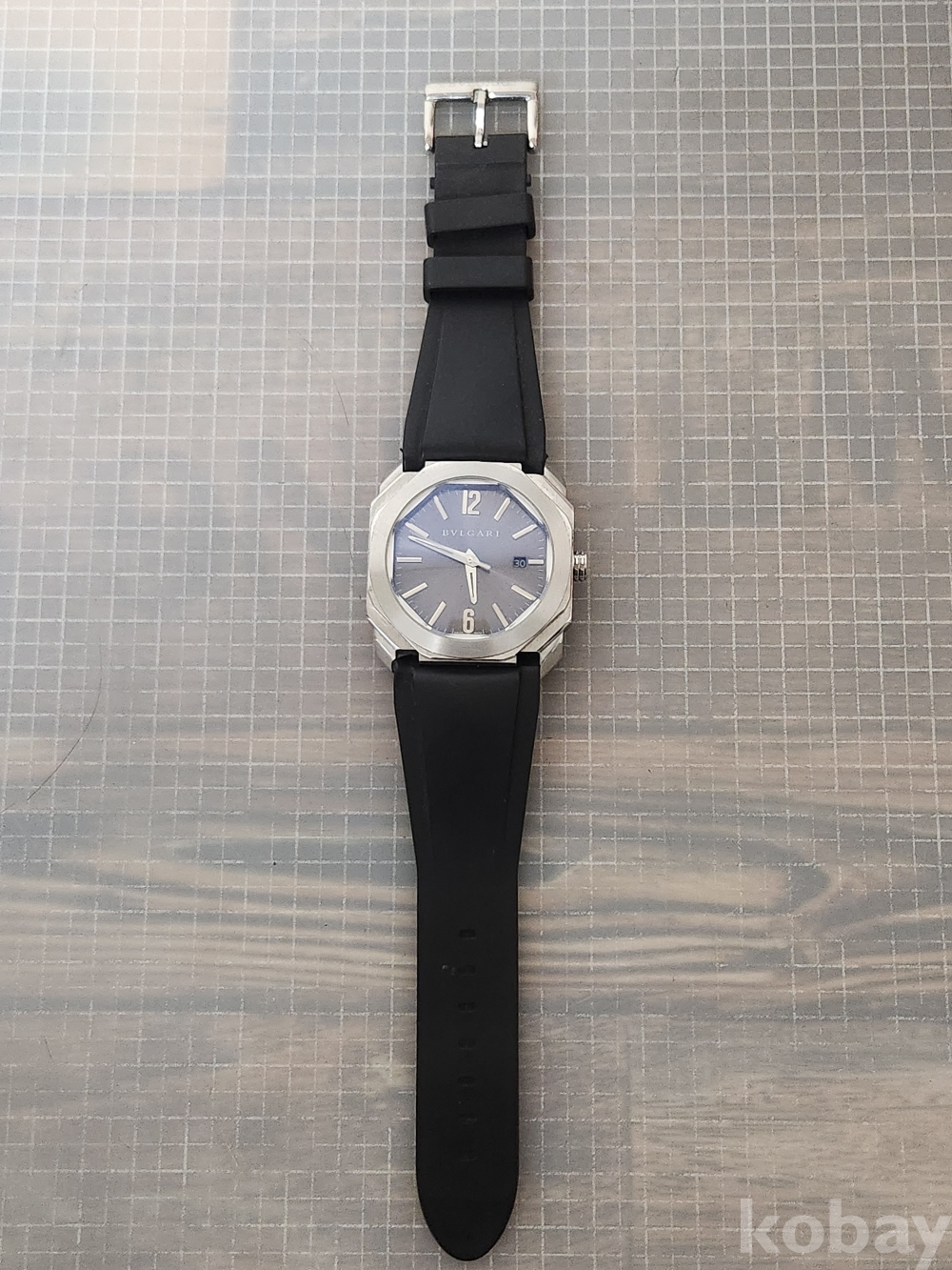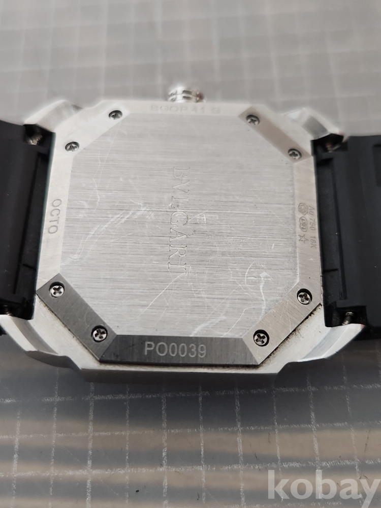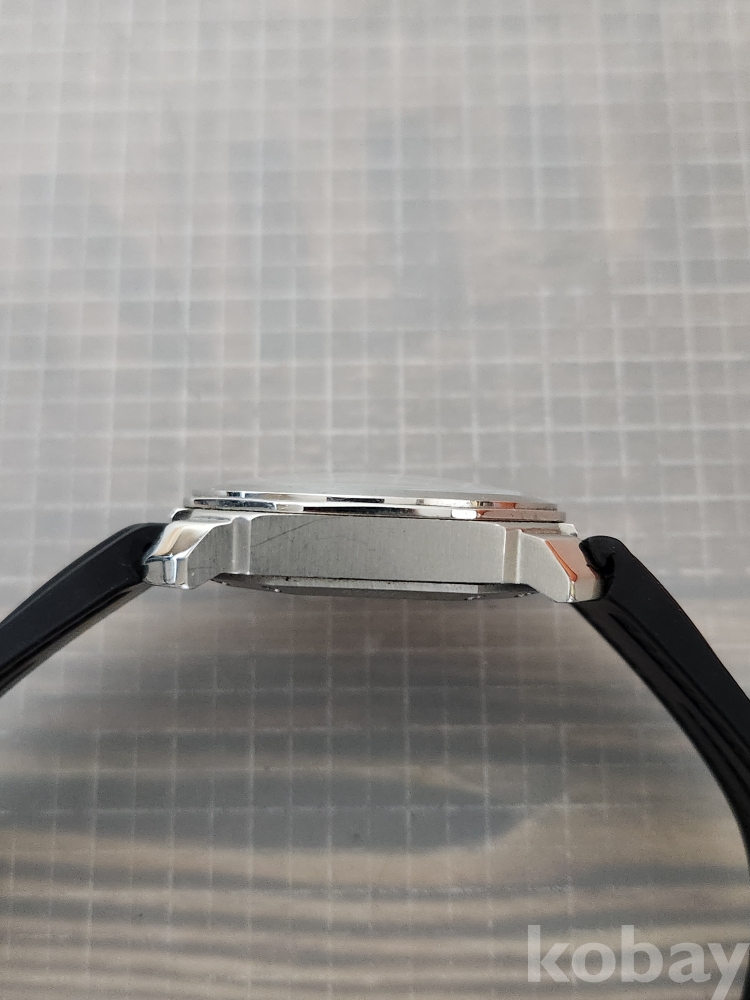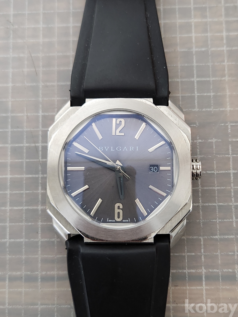 (땡처리) 불가리 옥토 모델입니다. 날짜 표시 기능이 있으며, 블랙 러버 스트랩이 특징입니다. 세련된 디자인으로 다양한 스타일에 잘 어울립니다.