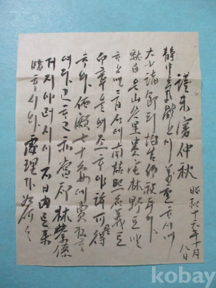 소화 16년 1941년 10월 8일 양식지에 쓰인 국,한 혼용의 간찰
