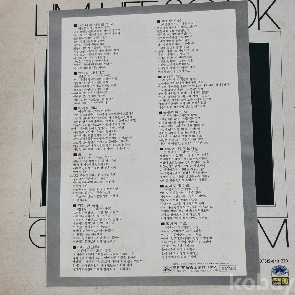 | 자켓상태 | EX : 약간의 마모, 모서리 찢김 존재 | 음반상태 | NM : 개봉했으나 미사용급, 스크래치 없음 | 발매정보 | 알수없음 | 가사지여부 | 유 |