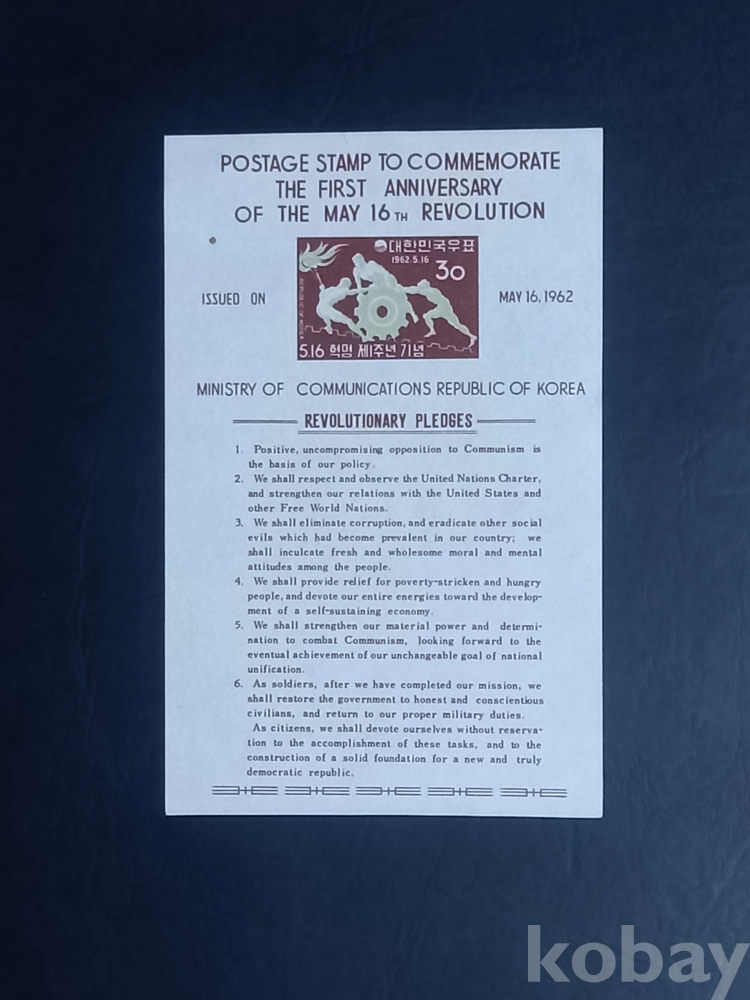 1962년 발행된 516혁명 1주년 기념 특별 시트 1종(영문)입니다