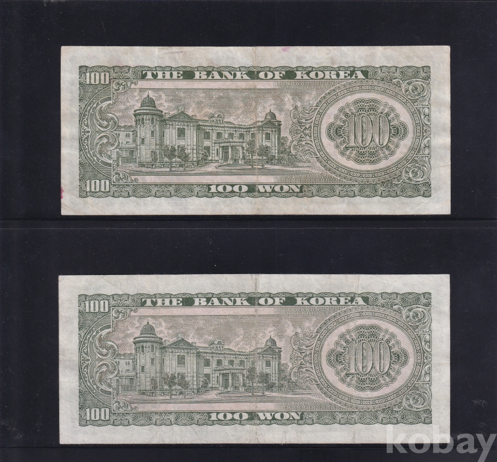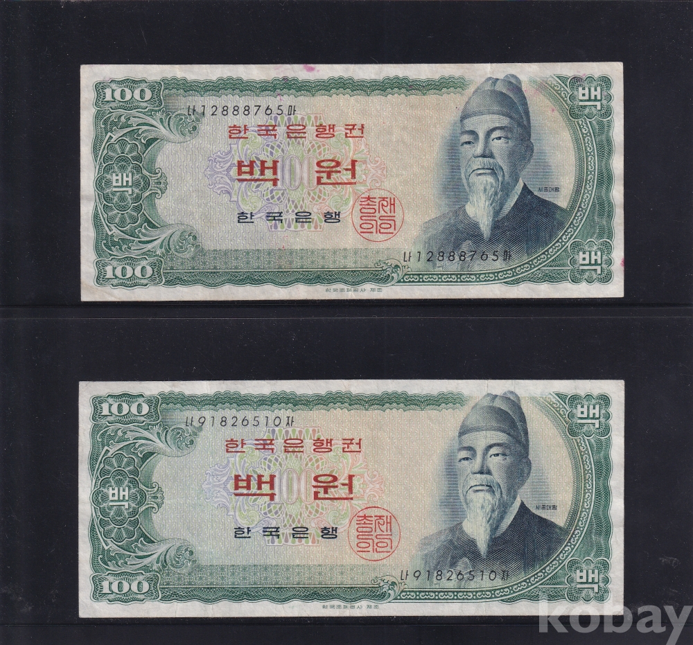 - 한국은행 1965년 세종 백원 사용제 지폐 2장 일괄