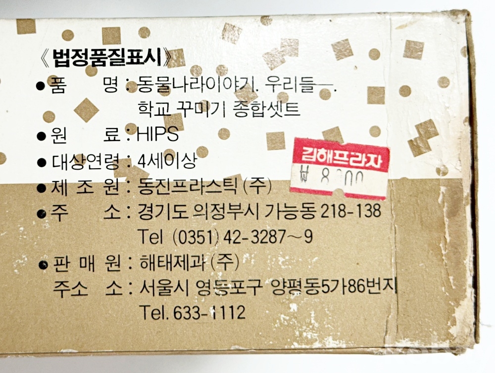 제조사 | 해태제과 / (주) 동진프라스틱 | 상태 | 박스 : 앞면 좌측 중앙 찢김, 우측 상단 비닐 뜯어짐, 상세 상태 사진 참고 |