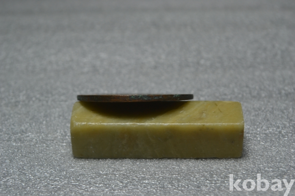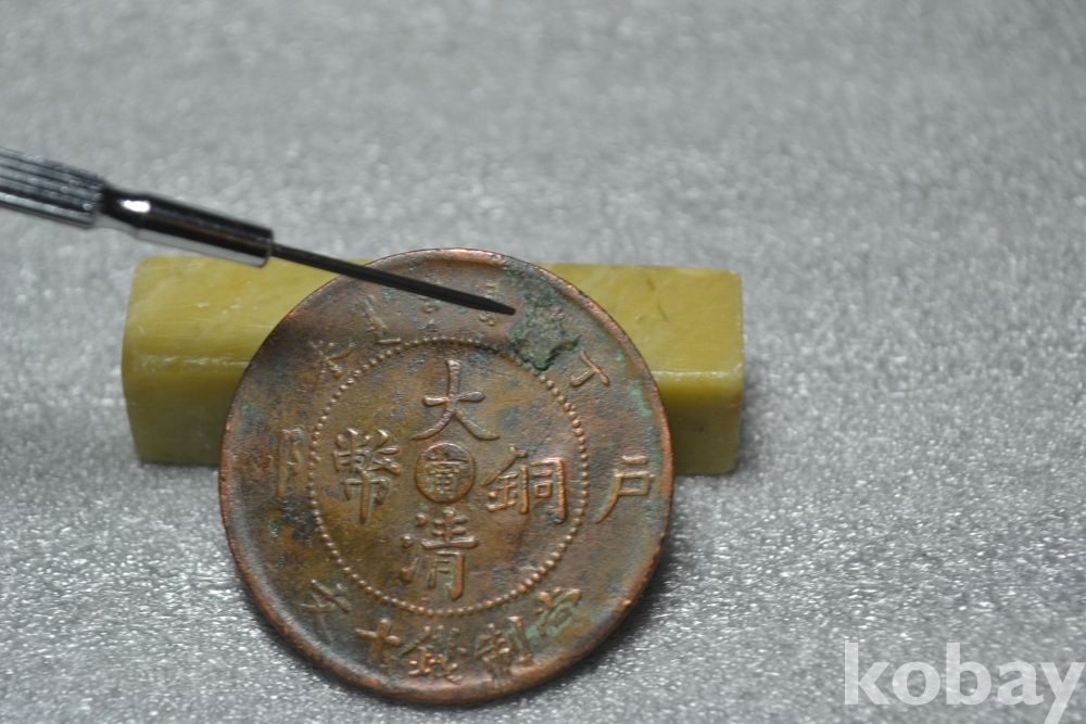 ㅡ> 대청동폐의 앞면부분을 보시면 굳은 때묻음 이물질이 일부 붙어 있습니다. (검은핀으로 가르킨 부분 2번째 사진참조)