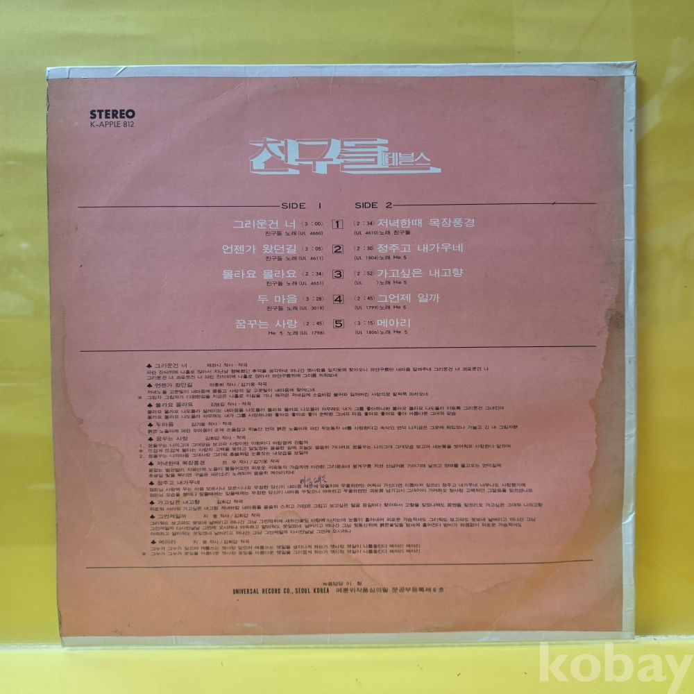 | 자켓상태 | EX : 약간의 마모, 모서리 찢김 존재 | 음반상태 | EX : 재생에 영향 없는 가벼운 기스 존재 | 발매정보 | 초반 | 가사지여부 | 무 |
