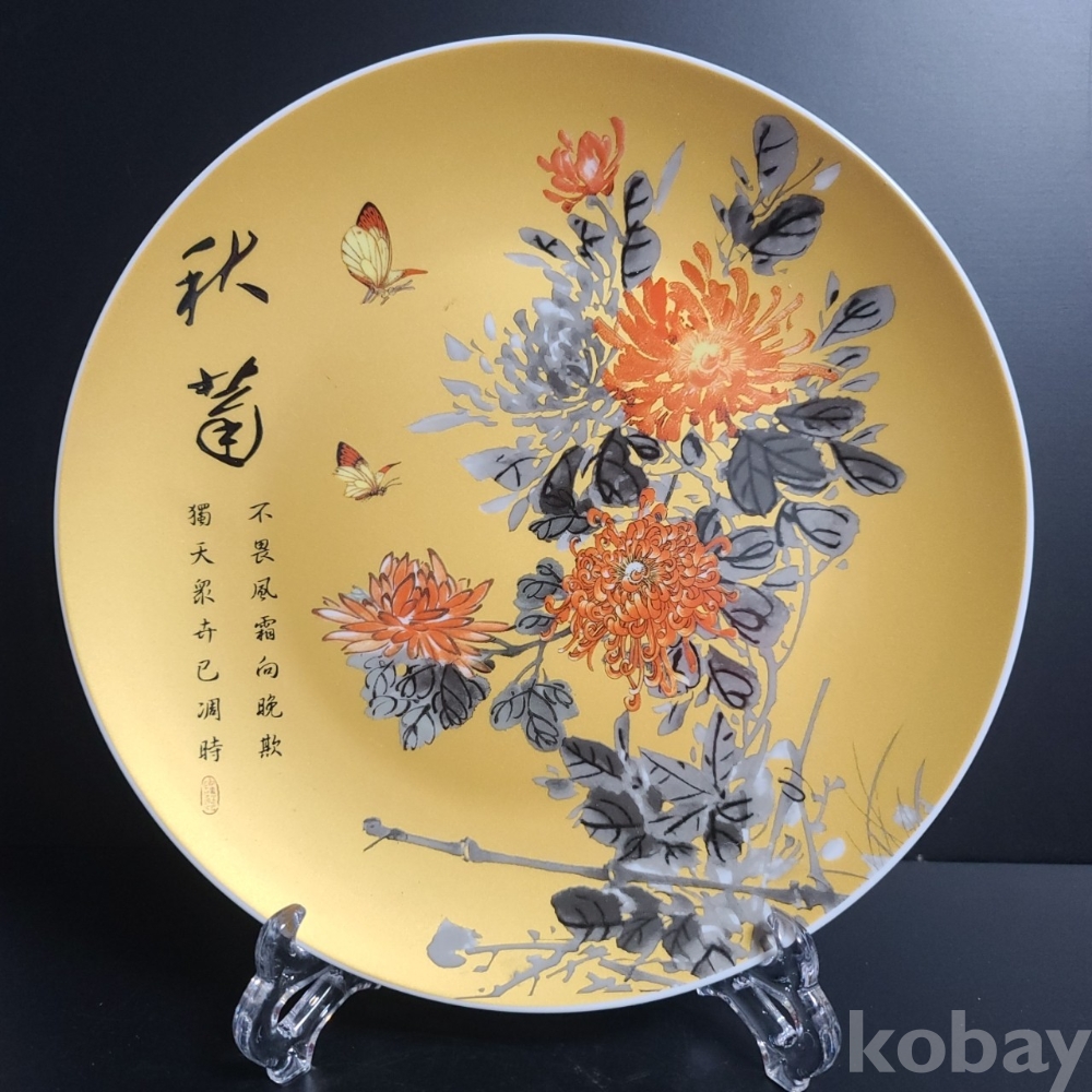 그림이 화려하게 전사된 도자기 접시입니다. 미사용 작품으로 좌대와 함께 제공되며 사이즈와 무게 모두 장식용으로 두고 보시기에 손색없는 작품입니다