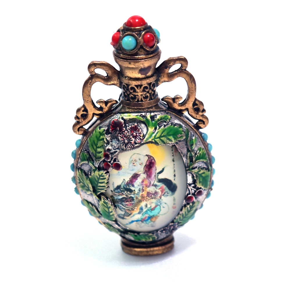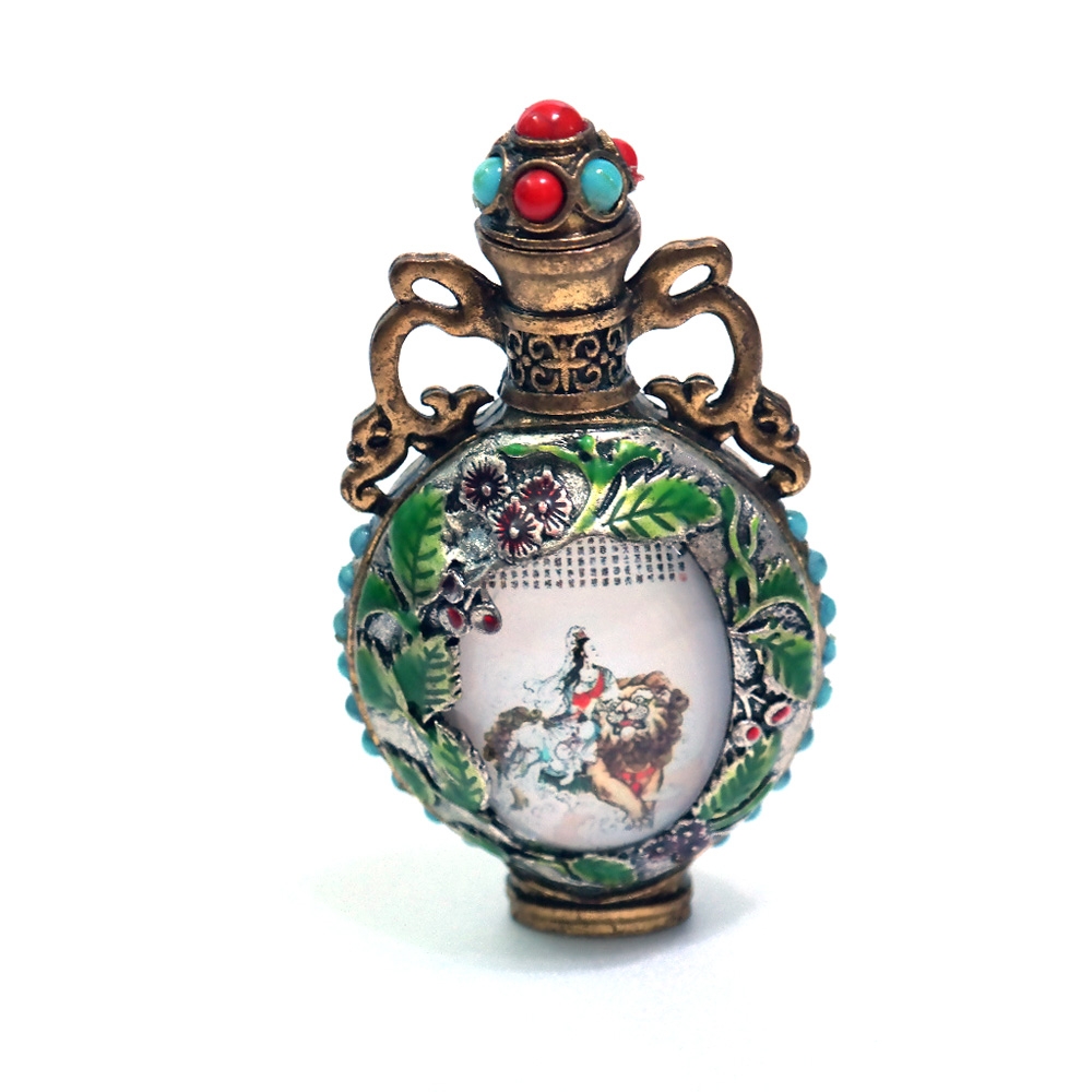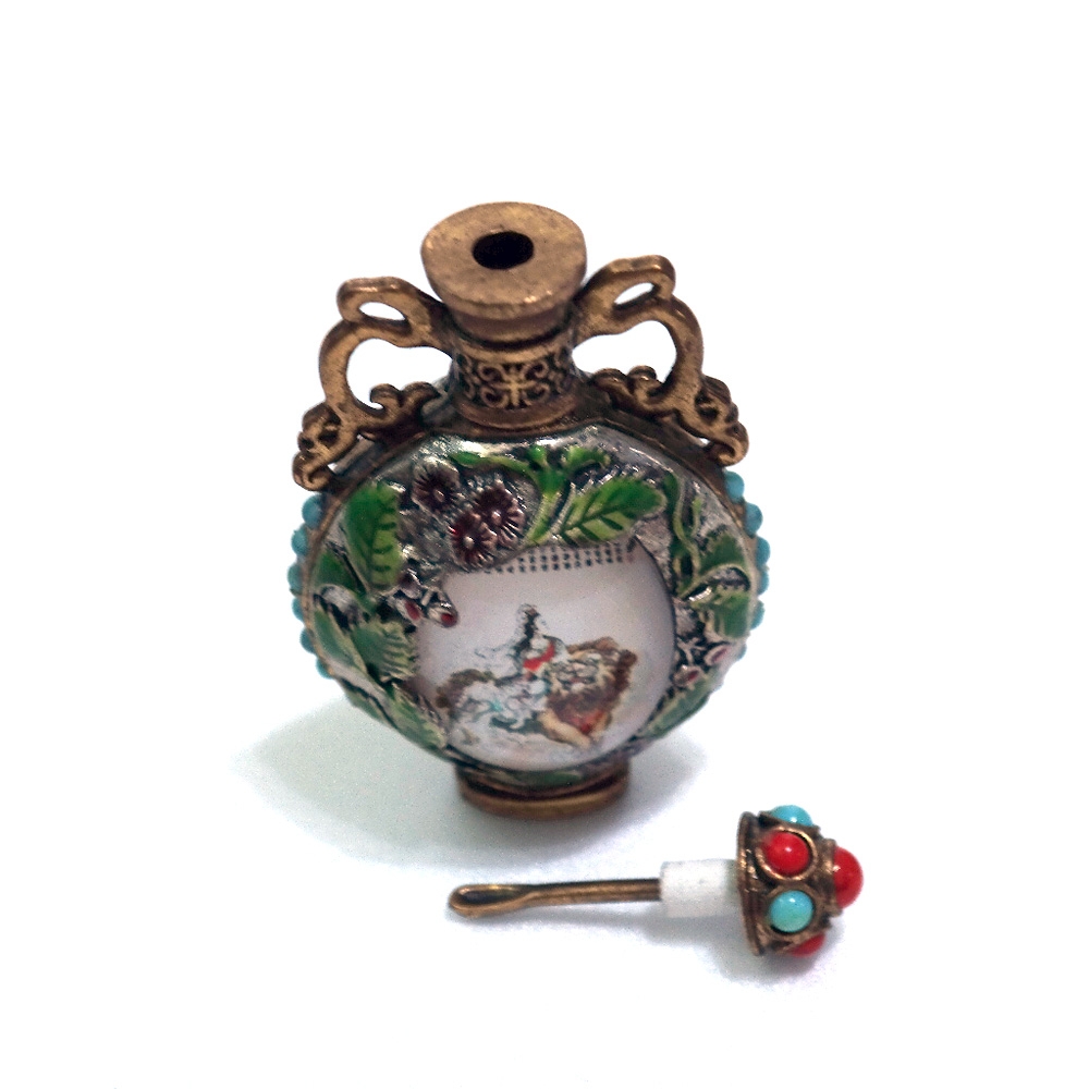 몸통은 합금재질로 보이며 에쁜장식이 부쳐져있는 향수병1점 입니다.