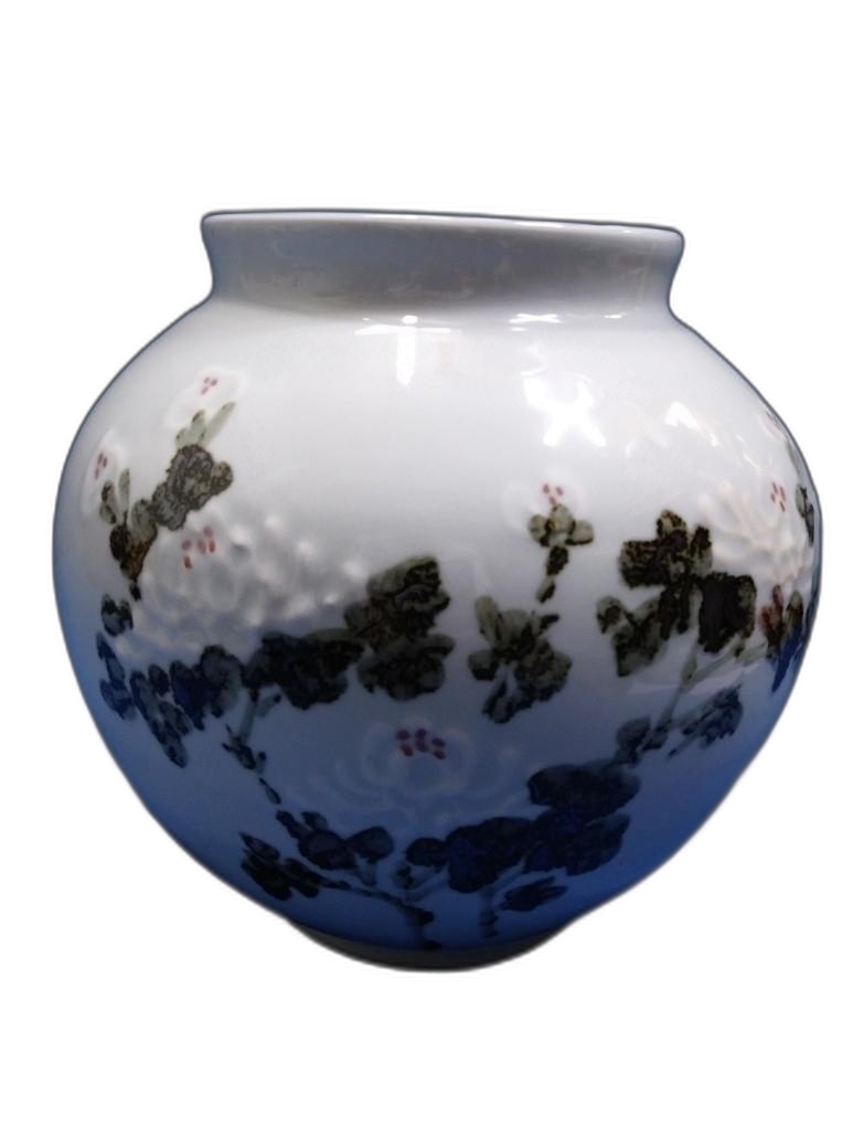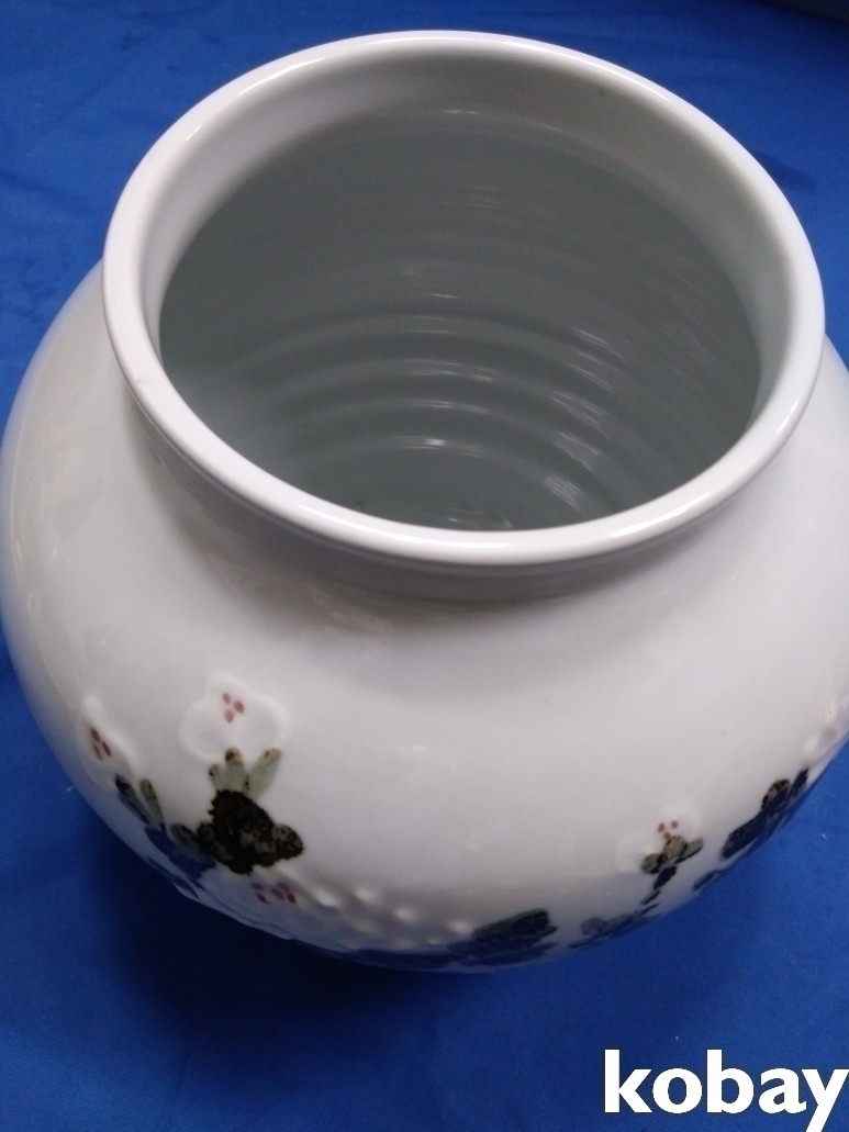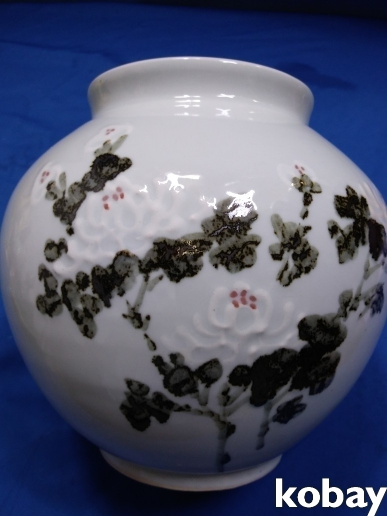 철화로 흰색 국화꽃을 돌출로 표현한 도자기 입니다.
