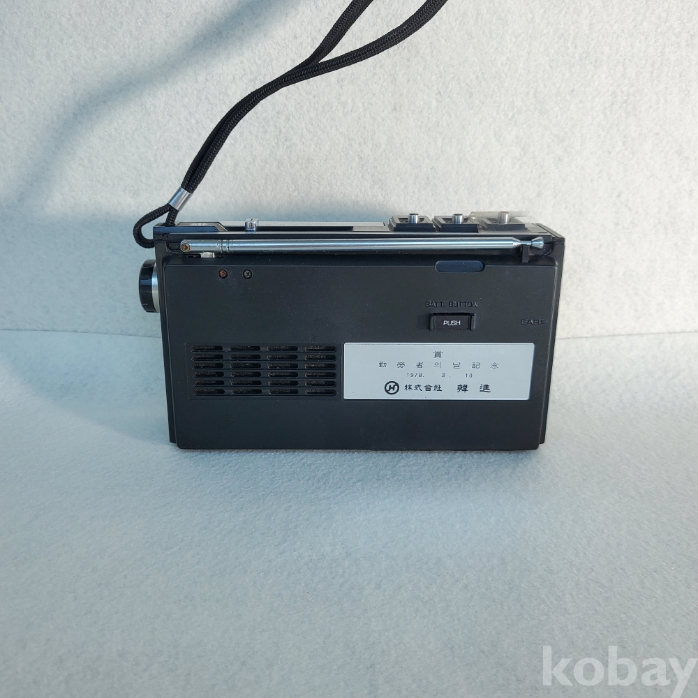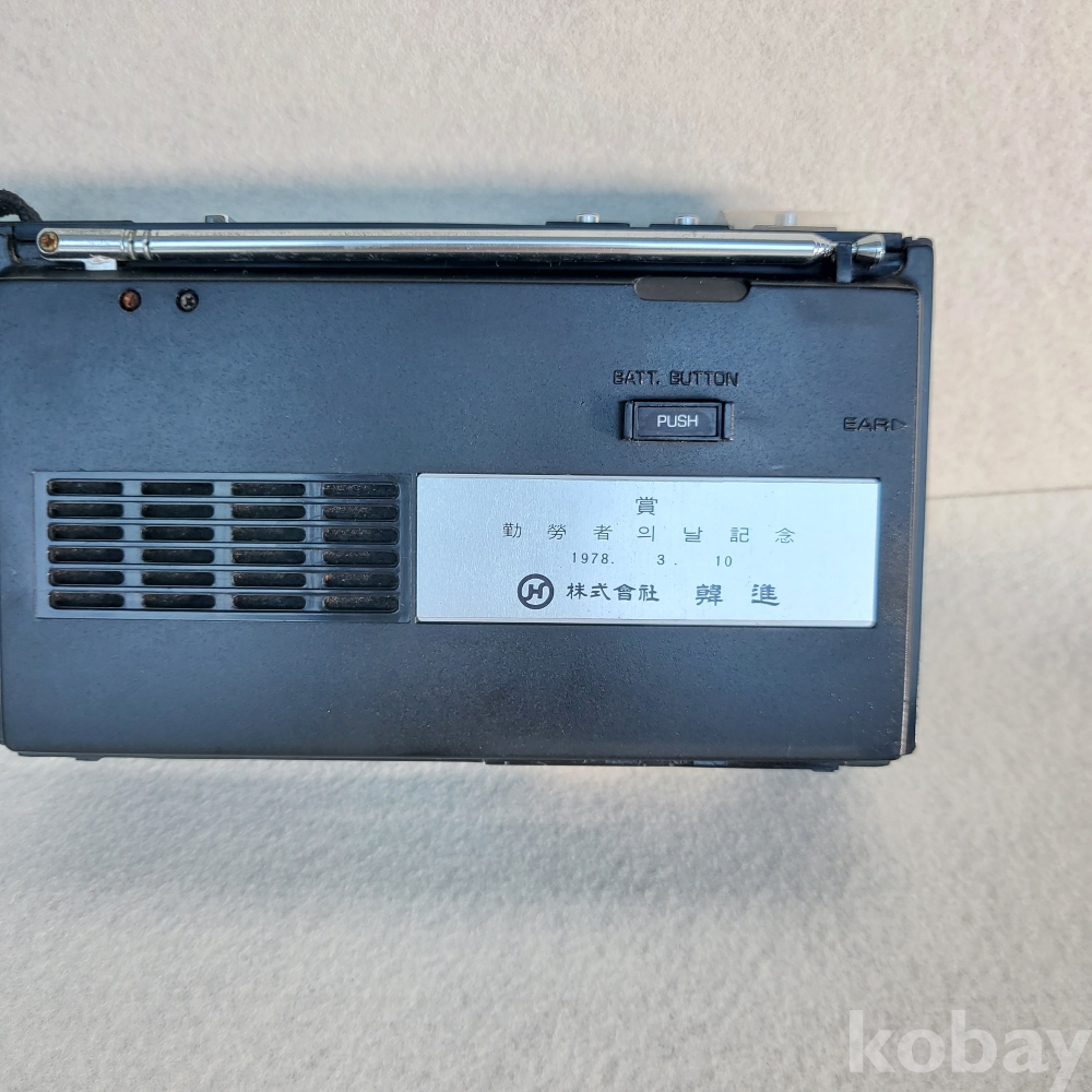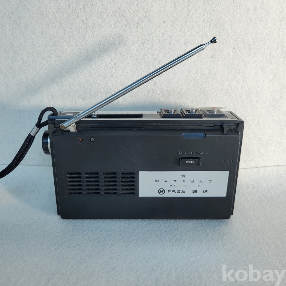 전면 하단 은빛 패널에 자랑스럽고 선명하게 새겨진 '근로자의 날 기념 1978. 3. 10 주식회사 한진'이라는 문구는 이 제품이 지닌 압도적인 역사적 정체성을 대변합니다. 라디오가 대중의 가장 중요한 정보 매체이자 가정의 값비싼 자산이었던 시절, 국가 경제를 이끌던 대기업이 근로자를 위한 최고급 포상으로 첨단 가전제품을 선택했던 당시의 기업 문화와 시대상을 생생하게 엿볼 수 있습니다.