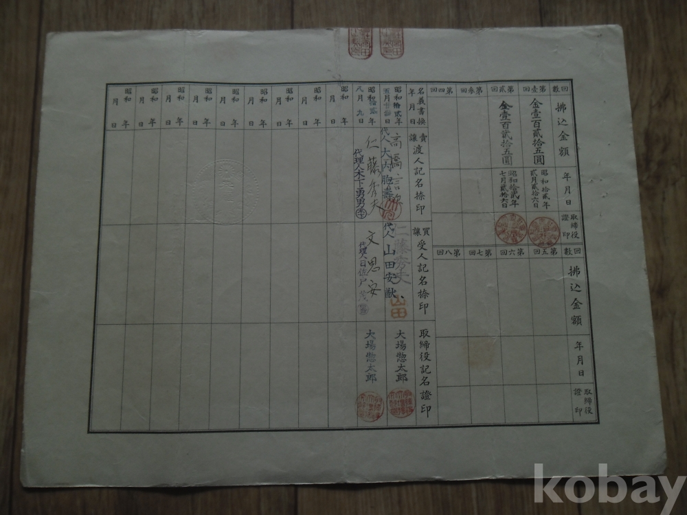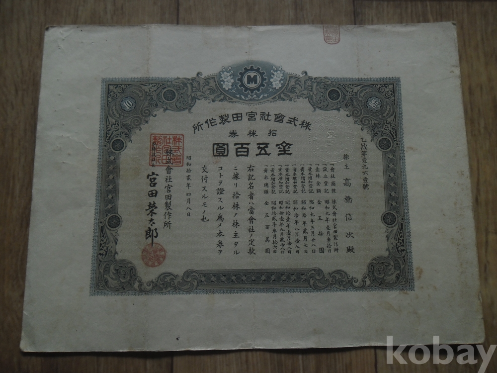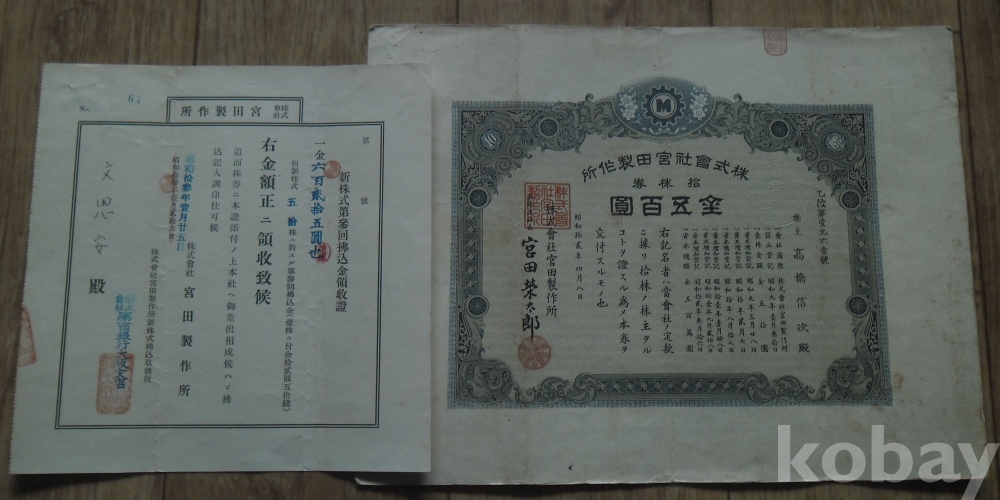 소화12년 일본 (주)궁전제작소 주권/제3회 주식불입금 영수증