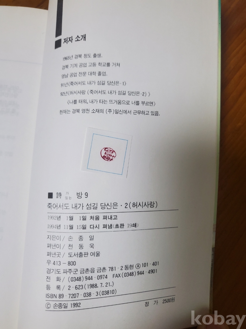1. 죽어서도 내가 섬길 당신은2 - 허시 사랑, 손종일, 도서출판 여울, 1994년, 161쪽, 저자 서명본, 상태 상, 사진 참조