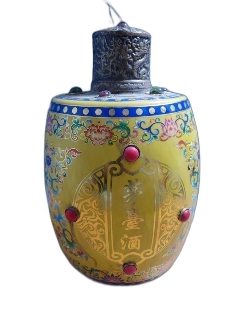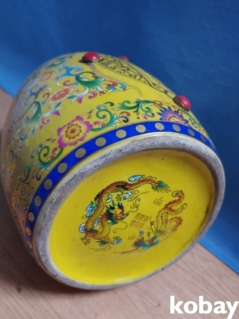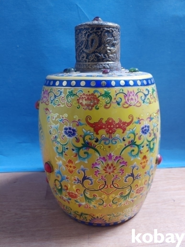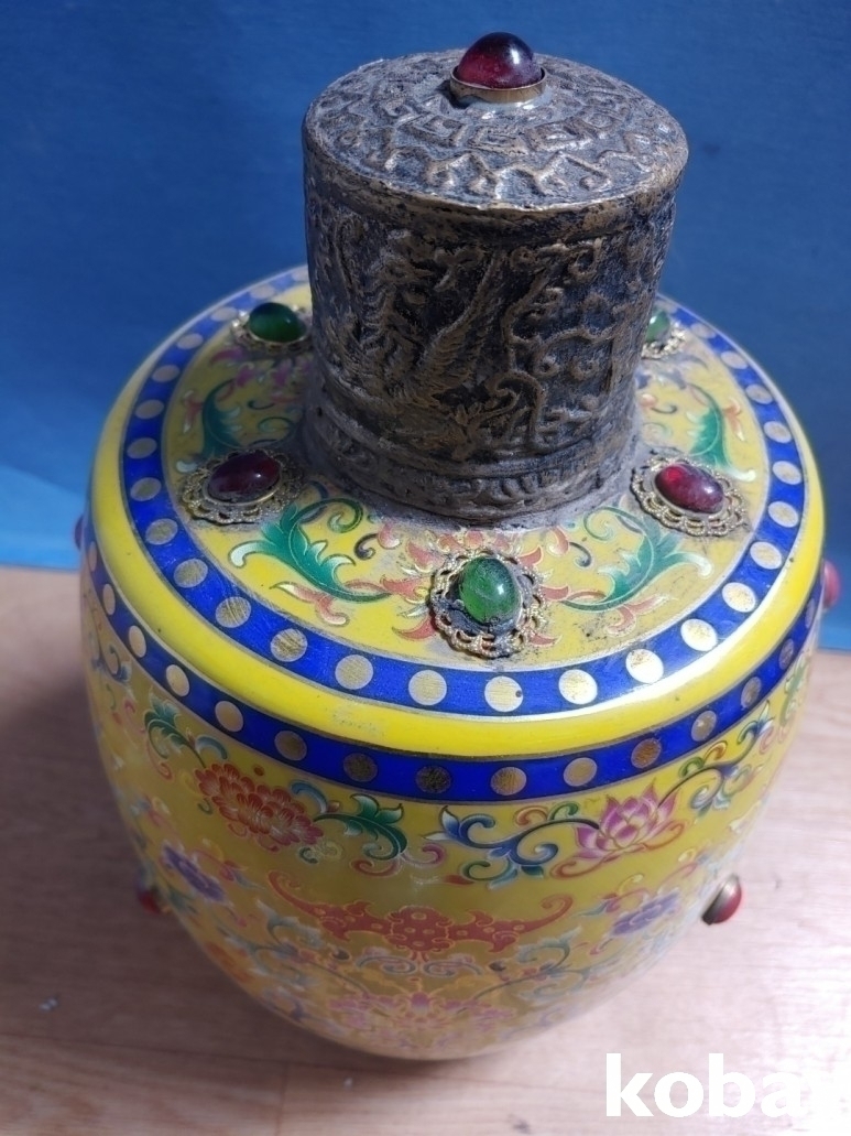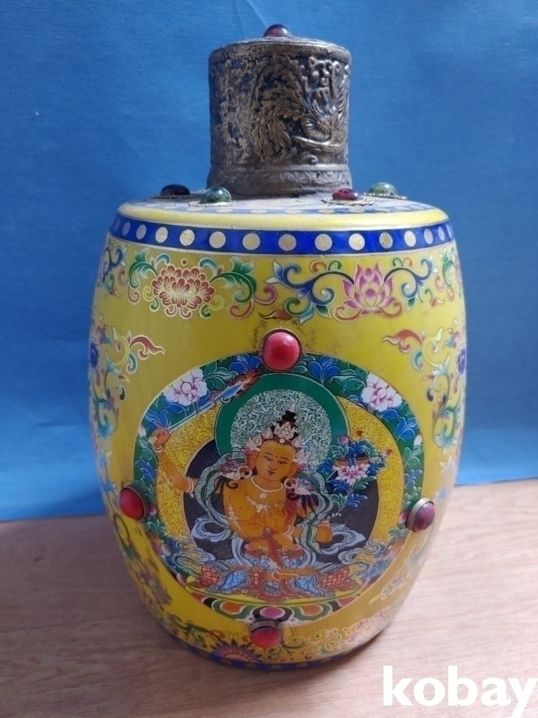 화려한 색상에 부처 도안이 있는 모대주 도자기 입니다.