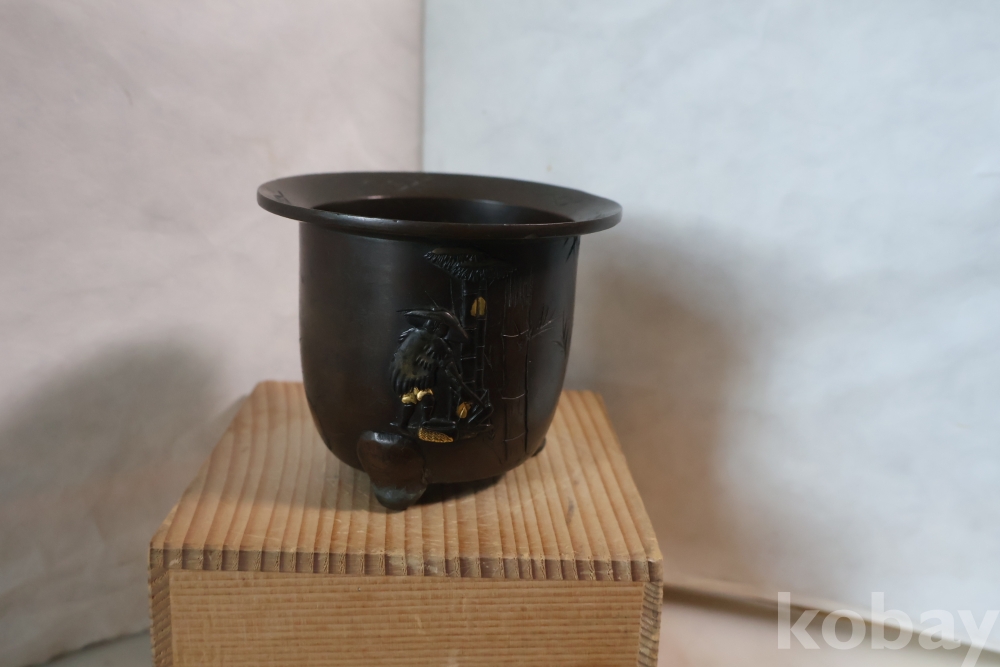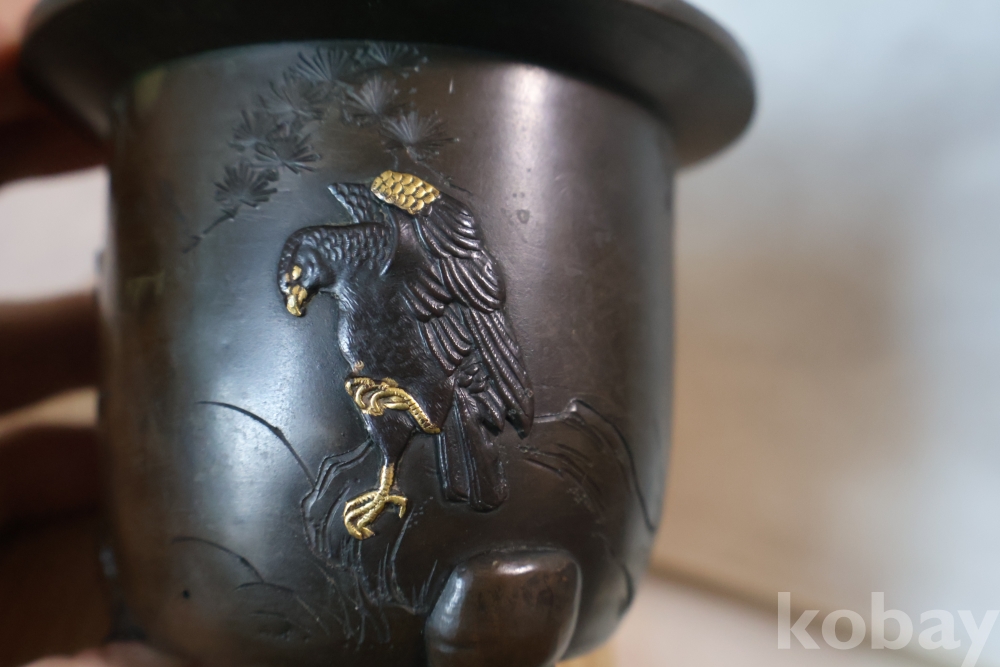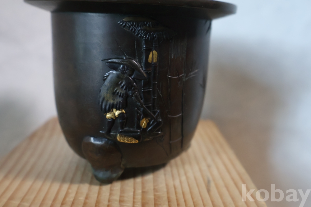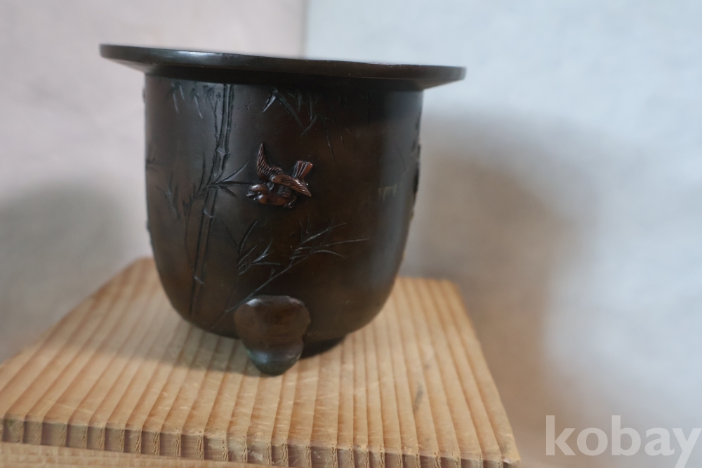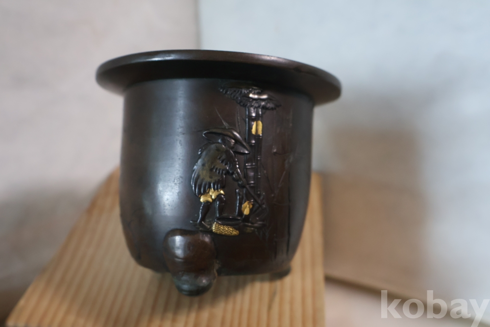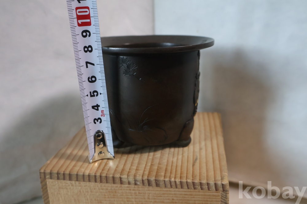 명치기의 금속 공예품 화분 임니다 두터운 부조 금 처리된 문양 대나무 독수리 새 농부 등등 명치기의 구미 유럽 수출 화분 임니다 극히 귀한 명품 임니다 일기일회의 명품