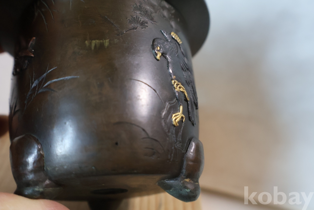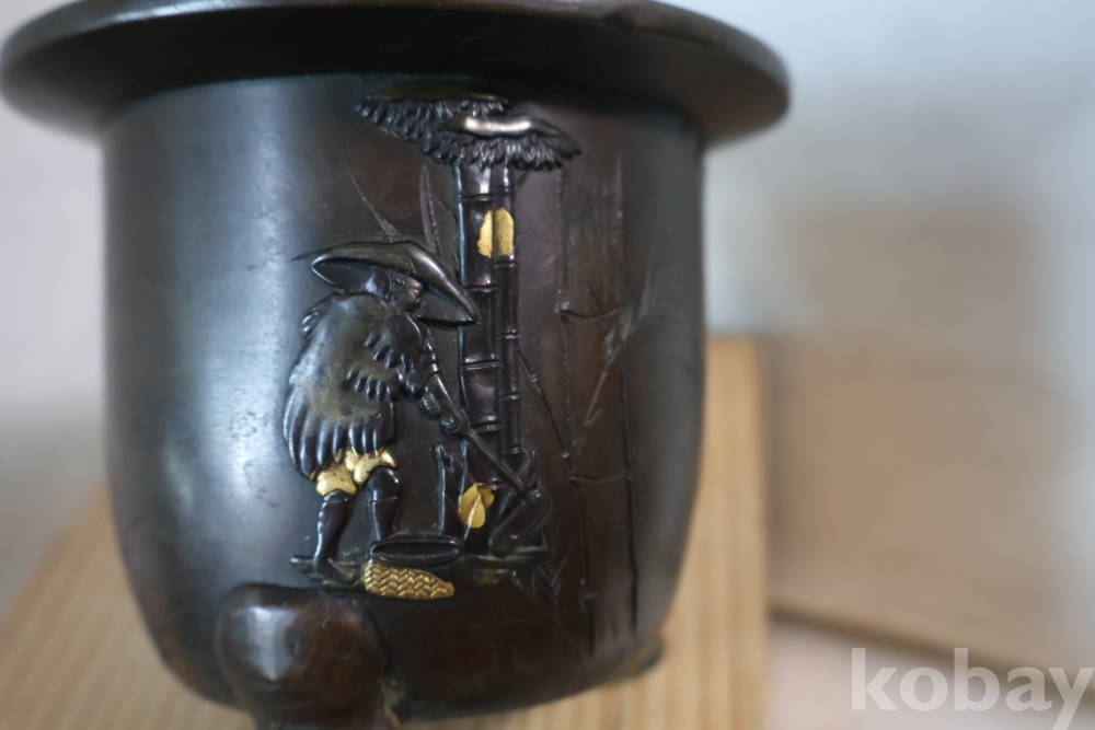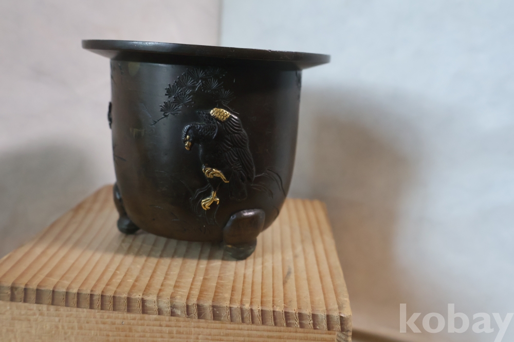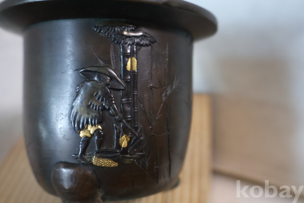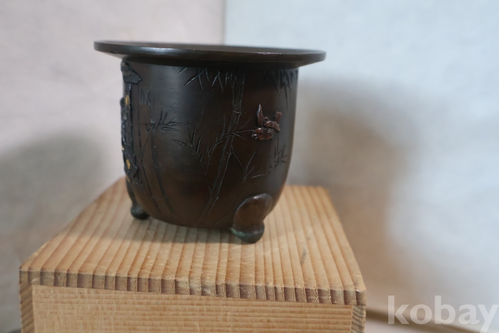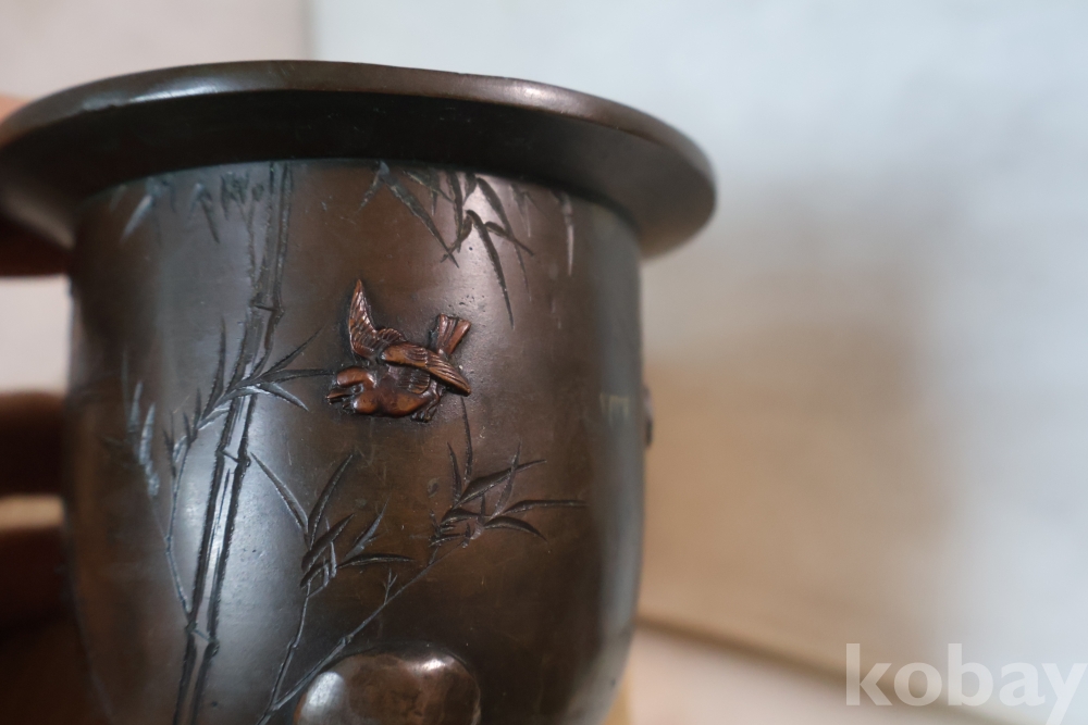 명치기의 금속 공예품 화분 임니다 두터운 부조 금 처리된 문양 대나무 독수리 새 농부 등등 명치기의 구미 유럽 수출 화분 임니다 극히 귀한 명품 임니다 일기일회의 명품